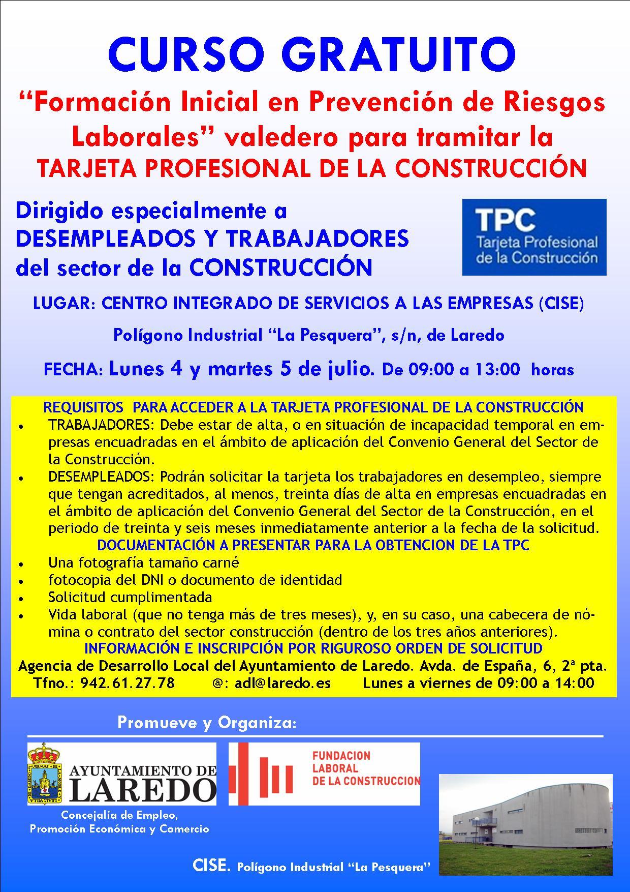 NUEVO CURSO GRATUITO: “FORMACIÓN INICIAL EN PREVENCIÓN DE RIESGOS LABORALES” VALEDERO PARA TRAMITAR LA TARJETA PROFESIONAL DE LA CONSTRUCCION