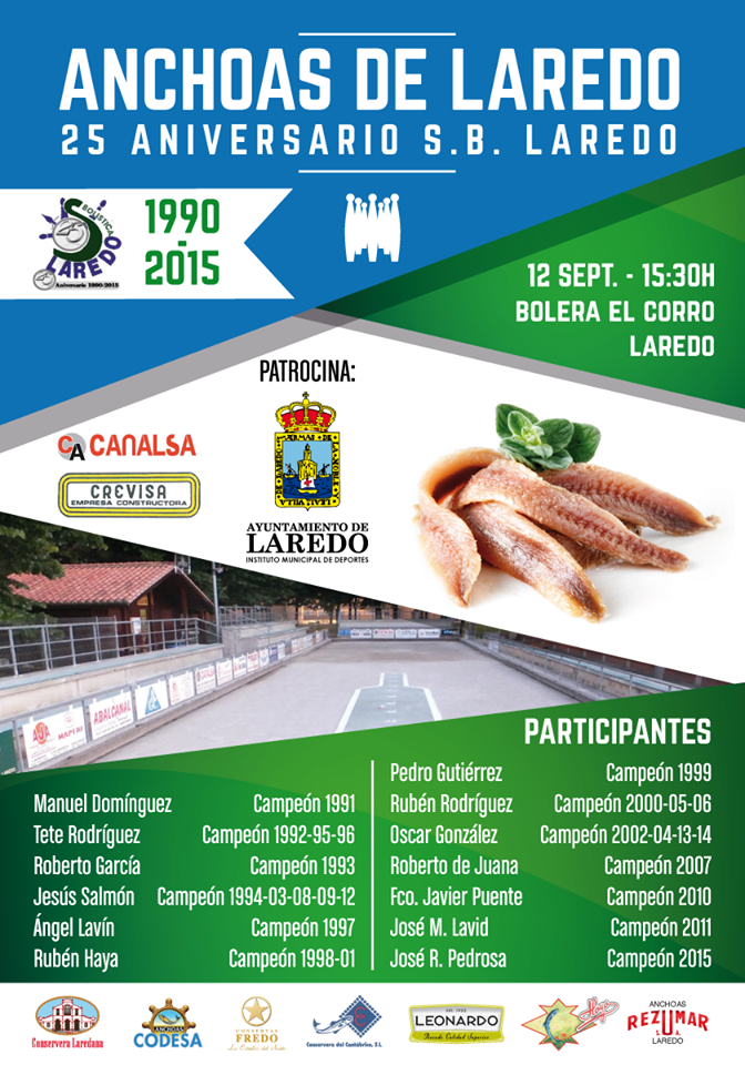 A las 15:30 hrs. en la Bolera "El Corro", Trofeo "ANCHOAS DE LAREDO"-XXV ANIVERSARIO SOCIEDAD BOLÍSTICA LAREDO" DE 1ª categoría. Intervendrán todos los ganadores en activo de los torneos del XXV TROFEO VILLA DE LAREDO.