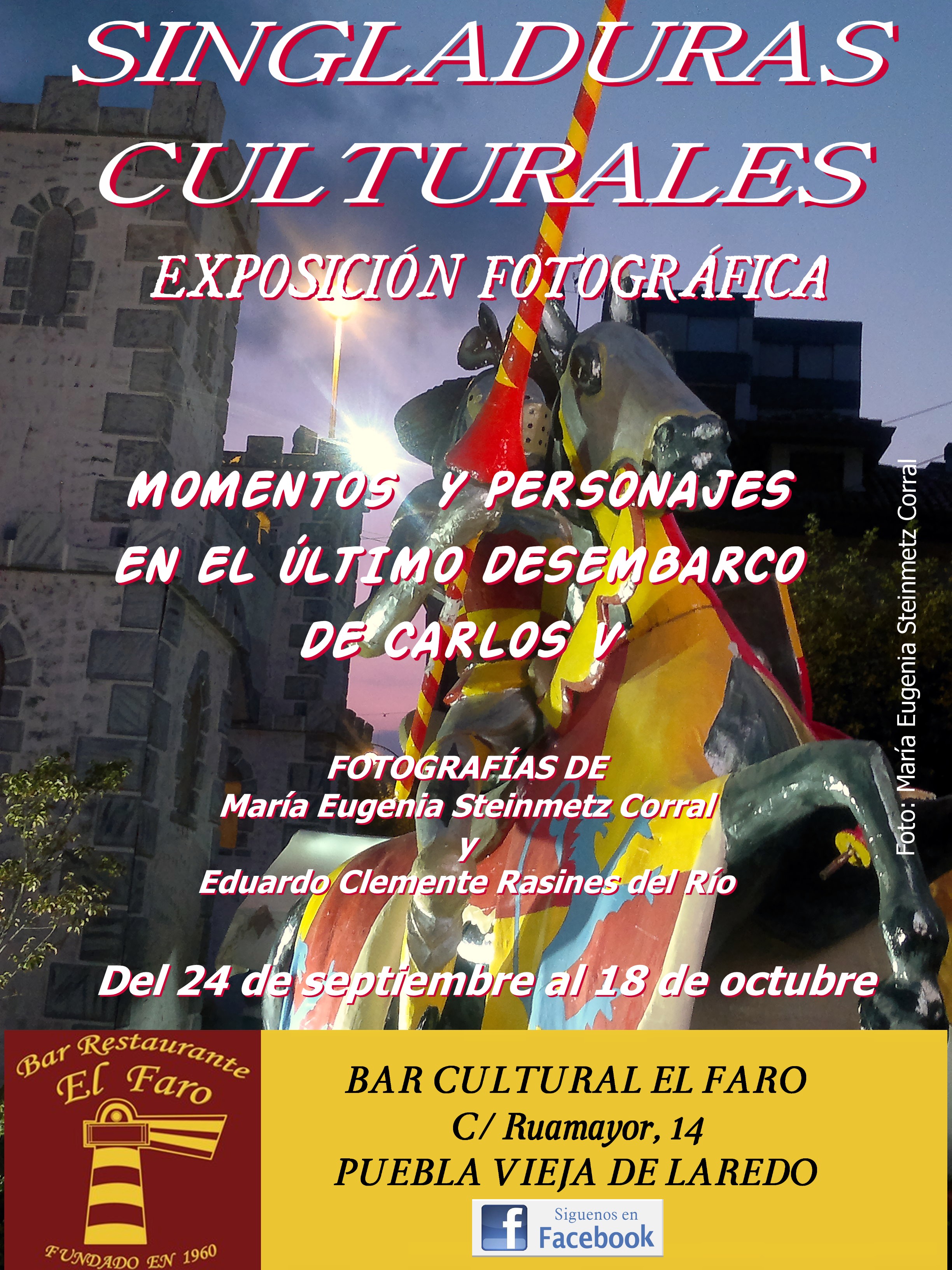 El Jueves 24 de Septiembre 2015 se inauguró la EXPOSICIÓN FOTOGRÁFICA “ MOMENTOS Y PERSONAJES EN EL ÚLTIMO DESEMBARCO DE CARLOS V”,que con motivo de las fiestas de “EL ÚLTIMO DESEMBARCO DE CARLOS V”, y dentro del ciclo“SINGLADURAS CULTURALES”se puede contemplar en el BAR CULTURAL EL FARO, situado en la Rúamayor, 14 en pleno corazón de la PUEBLA VIEJA DE LAREDO.