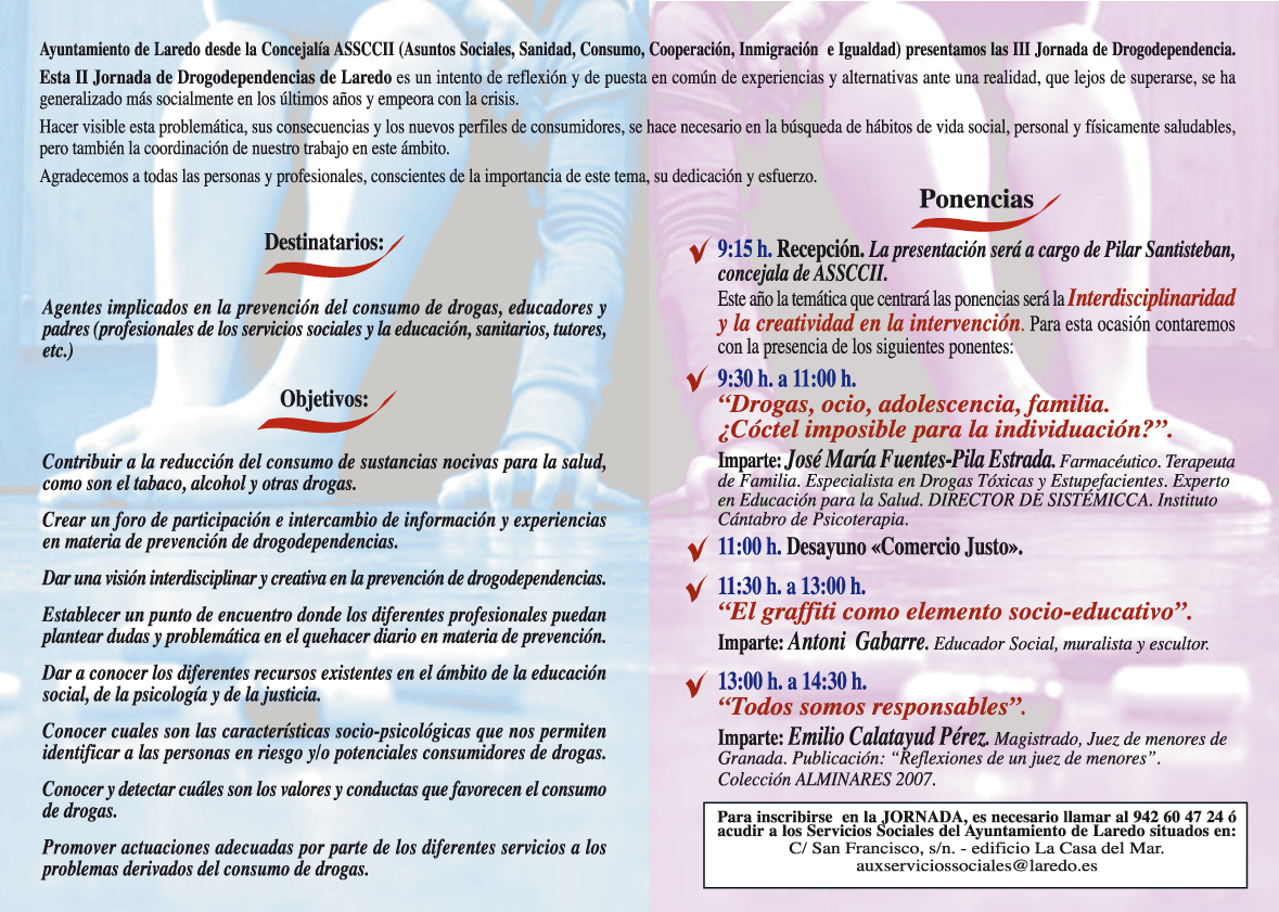 TERCERA JORNADA SOBRE PREVENCIÓN DE DROGODEPENDENCIAS”DE LAREDO, que tendrá lugar en el Salón de Actos del COLEGIO "VILLA DEL MAR" DE LAREDO, el día 11 de Diciembre de 2010 de 9:15 a 14:30 h.