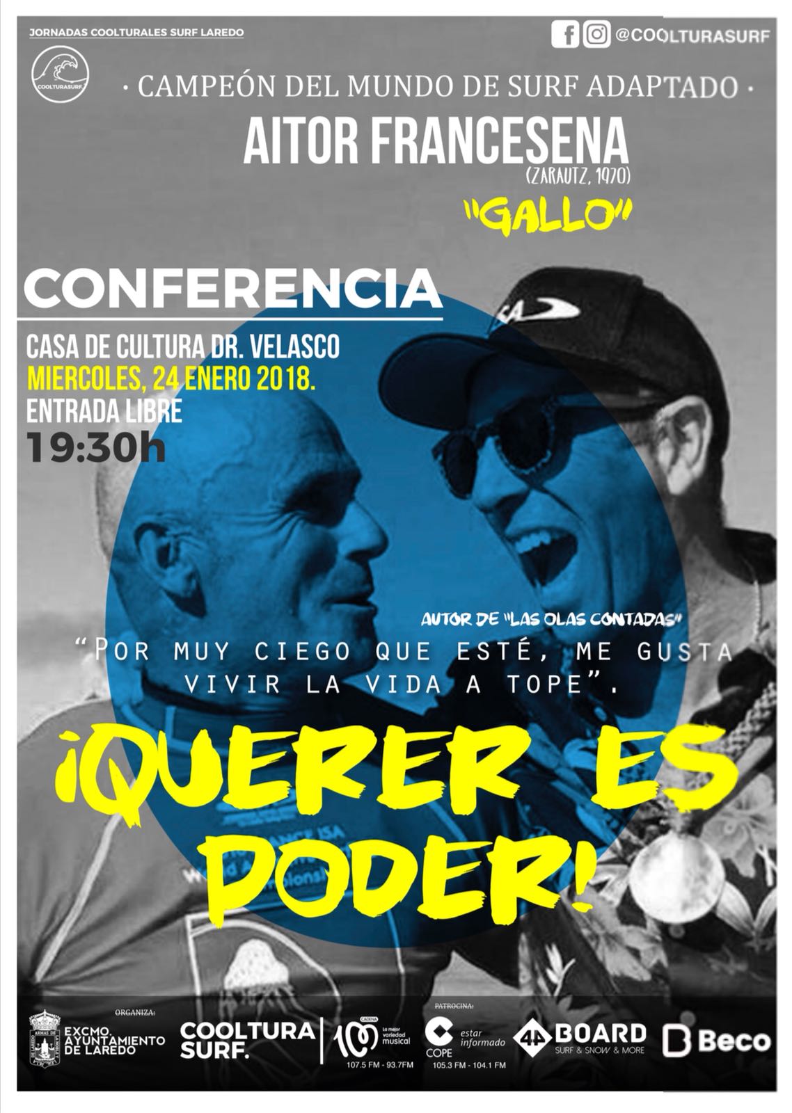 El entrenador de surfistas de primer nivel, Aitor Francesena “Gallo”, ofrecerá una conferencia "QUERER ES PODER", el miércoles 24 de enero, a las 19.30 horas en la casa de Cultura Doctor Velasco.