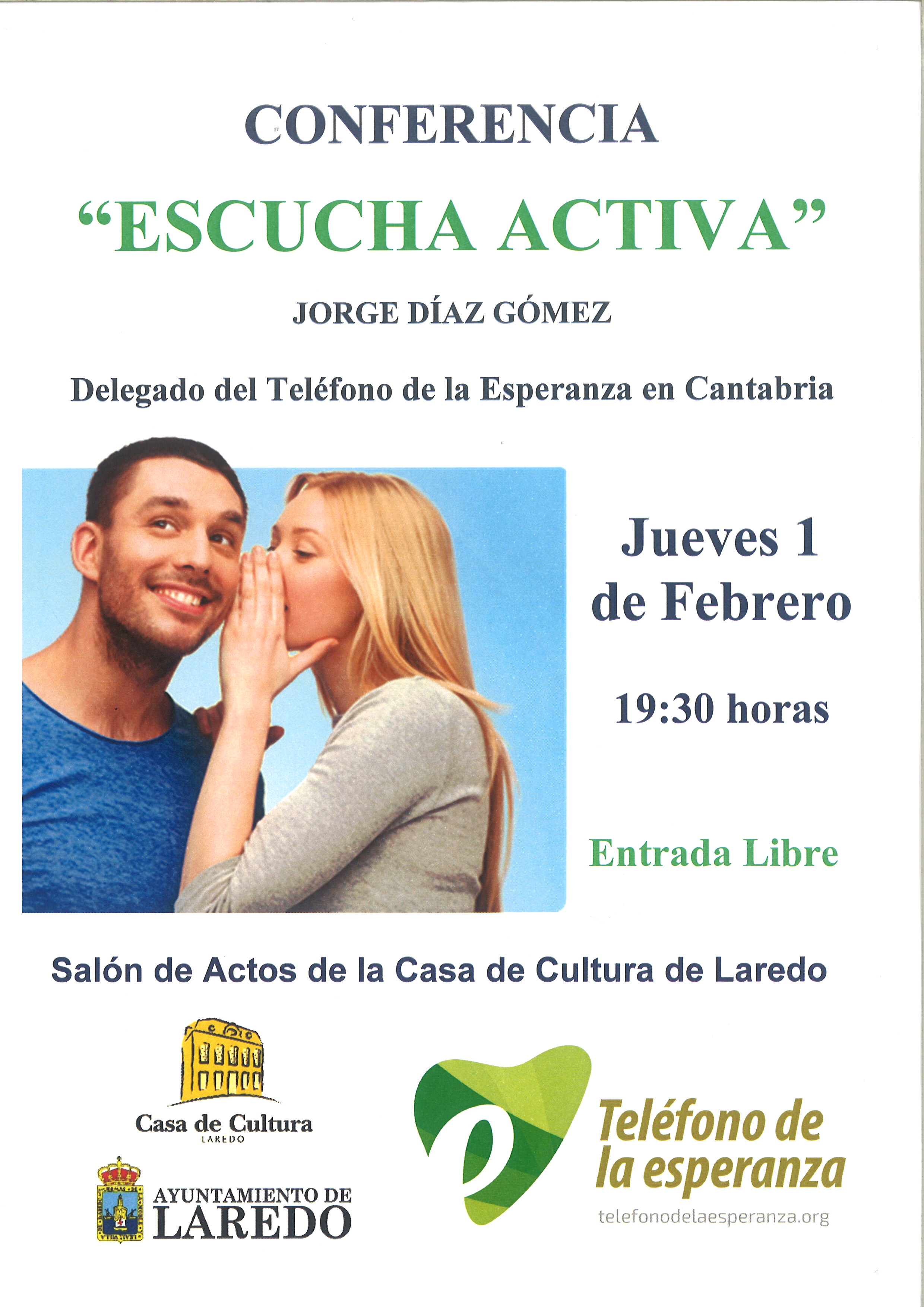 El jueves 1 de febrero, a las 19:30 h., en el Salón de Actos de la Casa de Cultura, conferencia "ESCUCHA ACTIVA" a cargo de Jorge Díaz Gómez, delegado del Teléfono de la Esperanza en Cantabria.