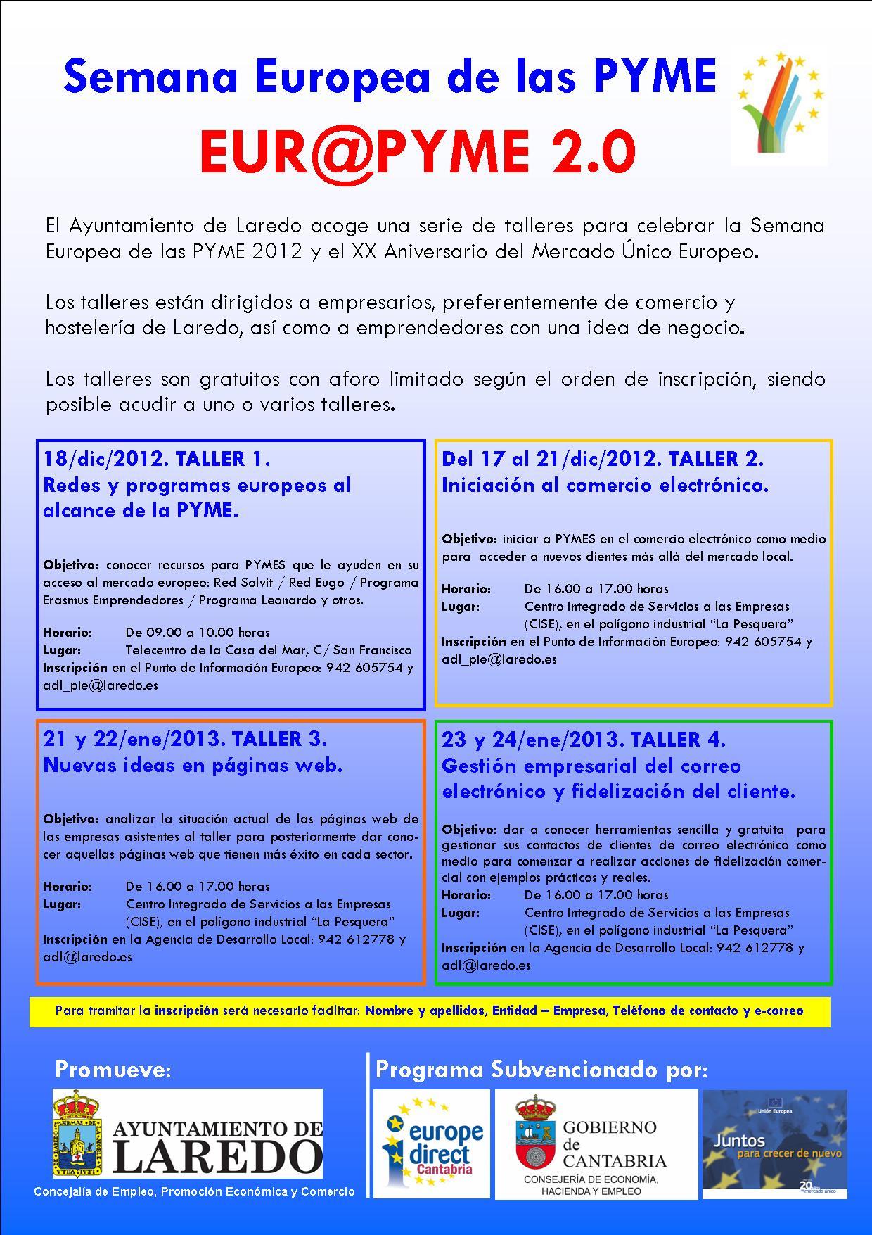 Con motivo de la celebración de la Semana Europea de la Pequeña y Mediana Empresa y del XX aniversario del Mercado Unico Europeo la Agencia de Desarrollo Local del Ayuntamiento de Laredo y su Punto de Información Europeo han organizado los talleres Eur€pyme 2.0.
