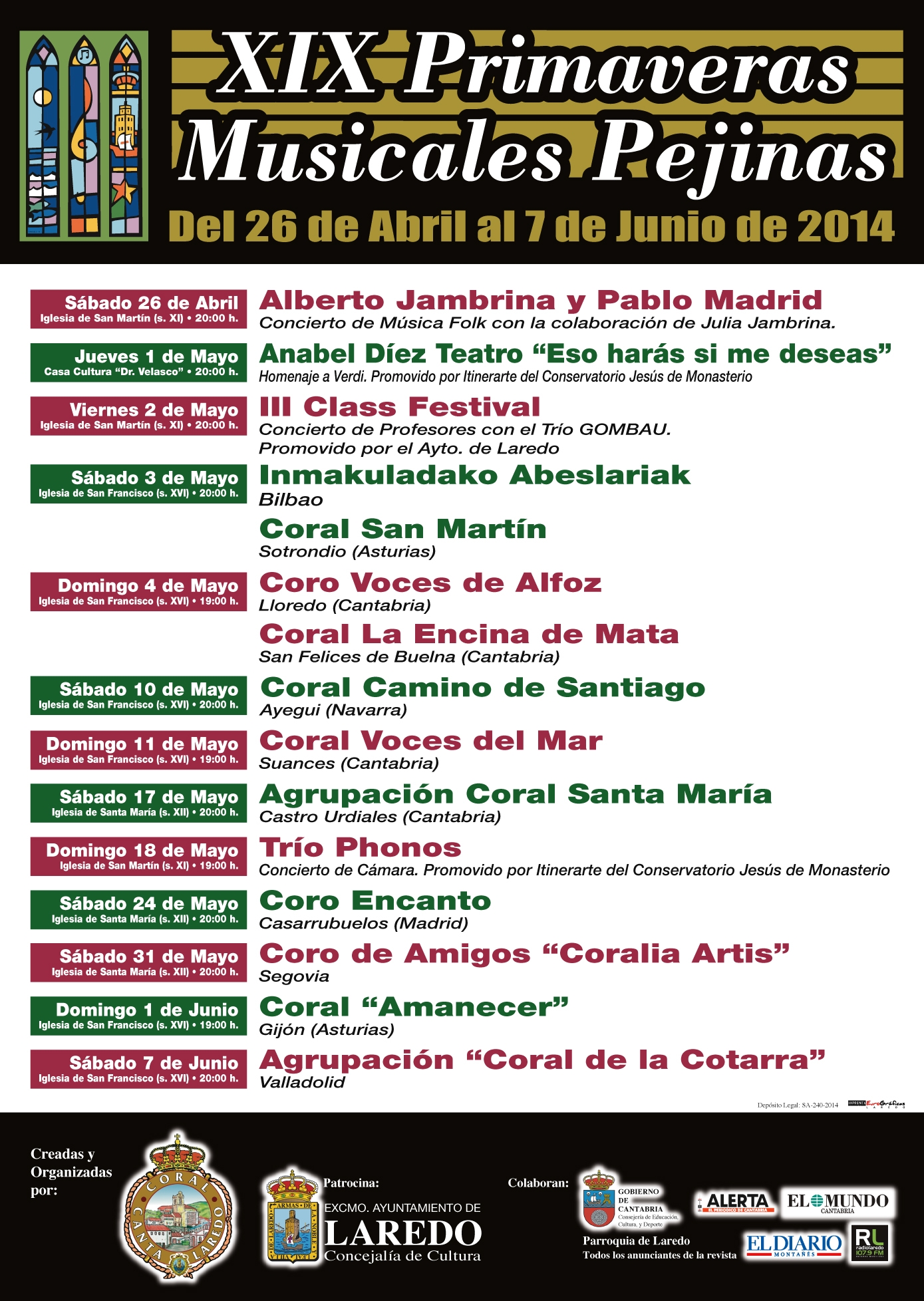La XIX edición de las Primaveras Musicales Pejinas incluye 12 conciertos y la representación de una obra de teatro. El programa comienza el sábado 26 de abril y concluirá el 7 de junio.