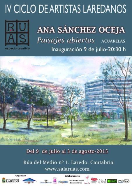 La Sala Rúas acogerá del 9 de julio al 3 de agosto de 2015, la exposición de acuarela de ANA SÁNCHEZ con la exposición “PAISAJES ABIERTOS”, dentro del IV Ciclo de Artistas Laredanos.