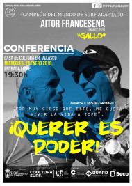 El entrenador de surfistas de primer nivel, Aitor Francesena “Gallo”, ofrecerá una conferencia "QUERER ES PODER", el miércoles 24 de enero, a las 19.30 horas en la casa de Cultura Doctor Velasco.