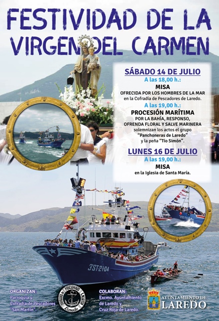 Sábado 14 de Julio: A las 18:00 hrs. misa en la Cofradía de Pescadores San Martín de Laredo y posteriormente procesión y ofrenda floral en la mar.