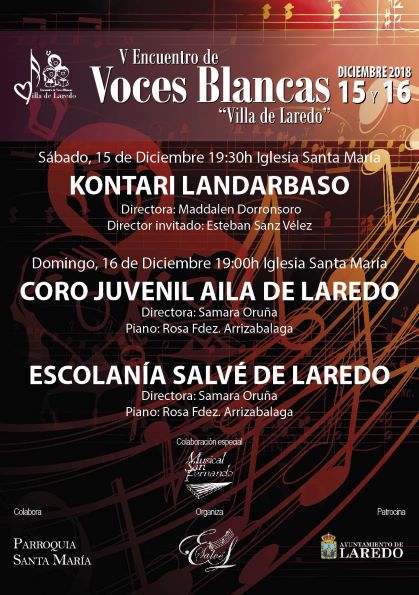 Dos conciertos previstos para el sábado 15 y el domingo 16, en la parroquia Santa María de la Asunción integrarán el programa del V Encuentro de Voces Blancas “Villa de Laredo”, organizados por la Escolanía Salvé.