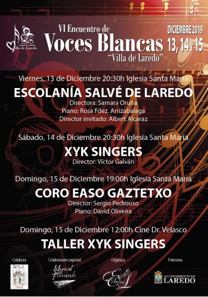 Tres conciertos y un taller, previstos para los días, 13,14 y 15 de diciembre, en la parroquia Santa María de la Asunción integrarán el programa del VI Encuentro de Voces Blancas “Villa de Laredo”, organizados por la Escolanía Salvé.