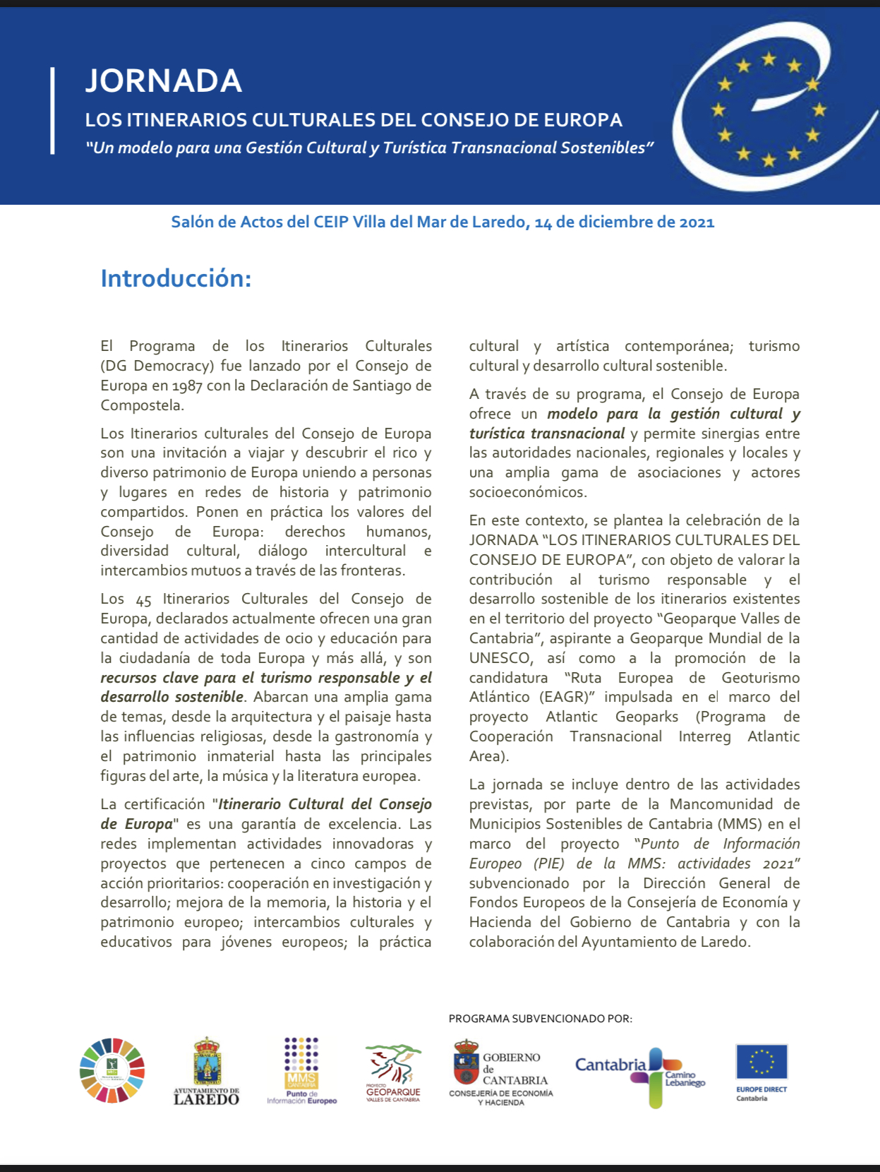 El 14 de diciembre, de 16:00 a 19:00 horas, se celebrará la jornada informativa “Los itinerarios culturales del Consejo de Europa” en el salón de actos del CEIP Villa del Mar.