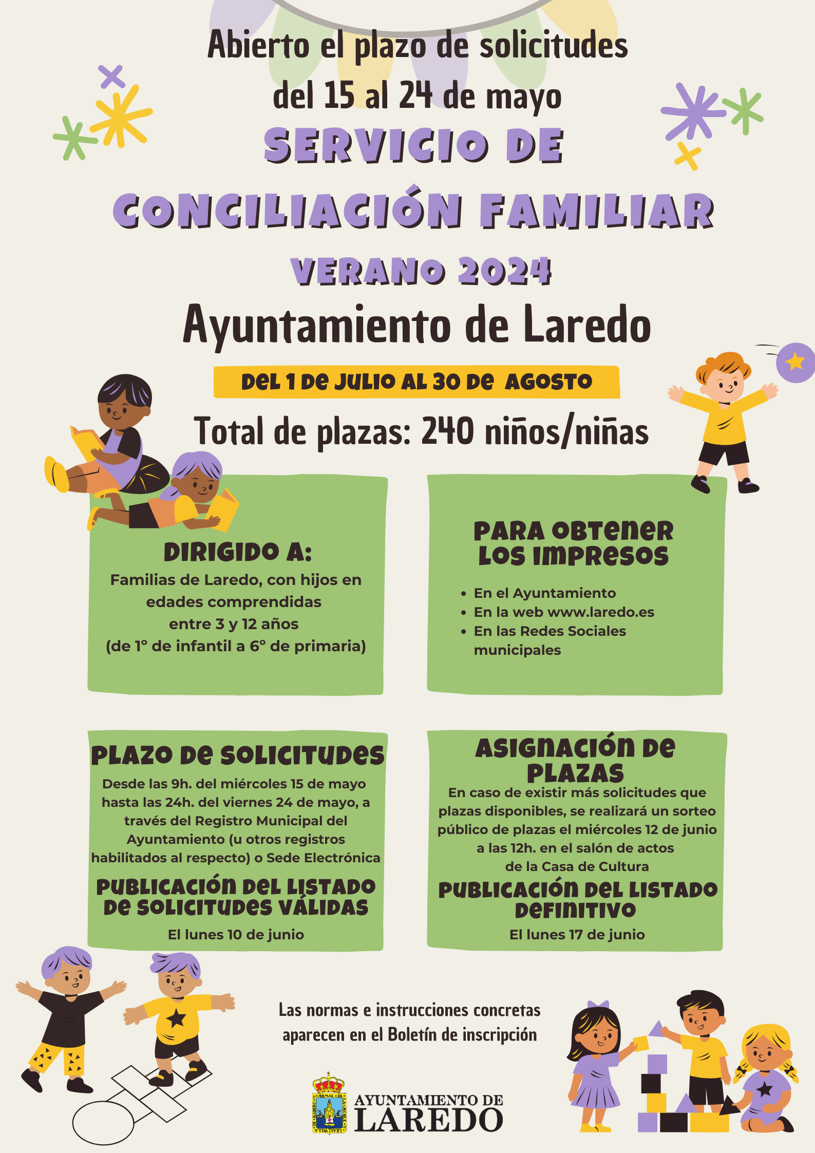 En el caso de que las solicitudes presentadas que cumplan los requisitos exigidos, superen el número de plazas disponibles, se realizará sorteo público para la adjudicación de las mismas el miércoles 12 de junio a las 12:00h en el Salón de Actos de la Casa de Cultura de Laredo.