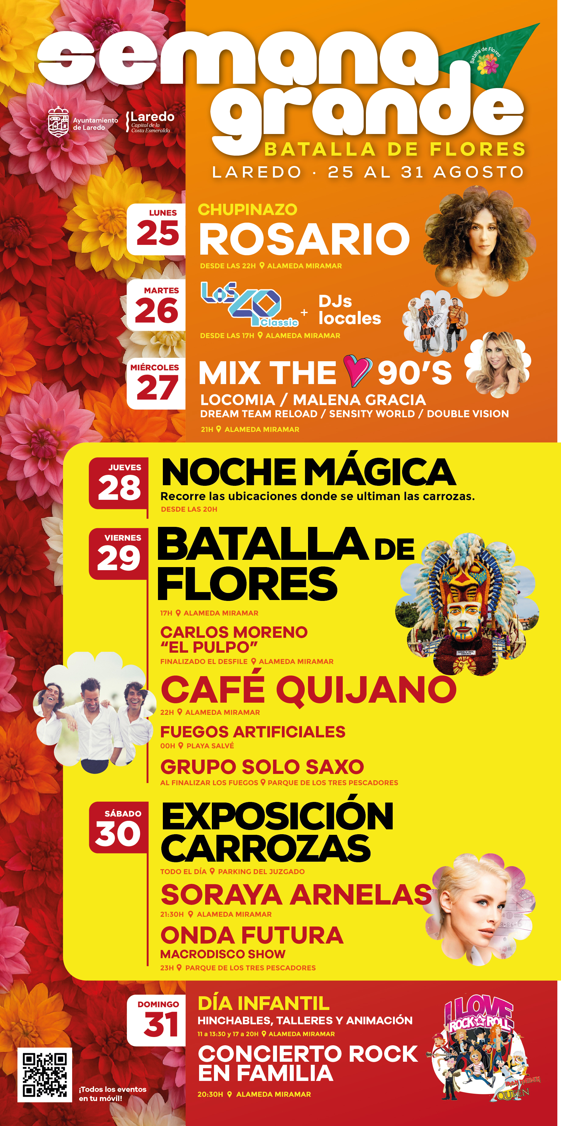Del 25 al 31 de agosto, Laredo celebrará la SEMANA GRANDE BATALLA DE FLORES, con un amplio programa de actividades, que tiene como día grande la BATALLA DE FLORES (29 de agosto), declarada Fiesta de Interés Turístico Nacional.