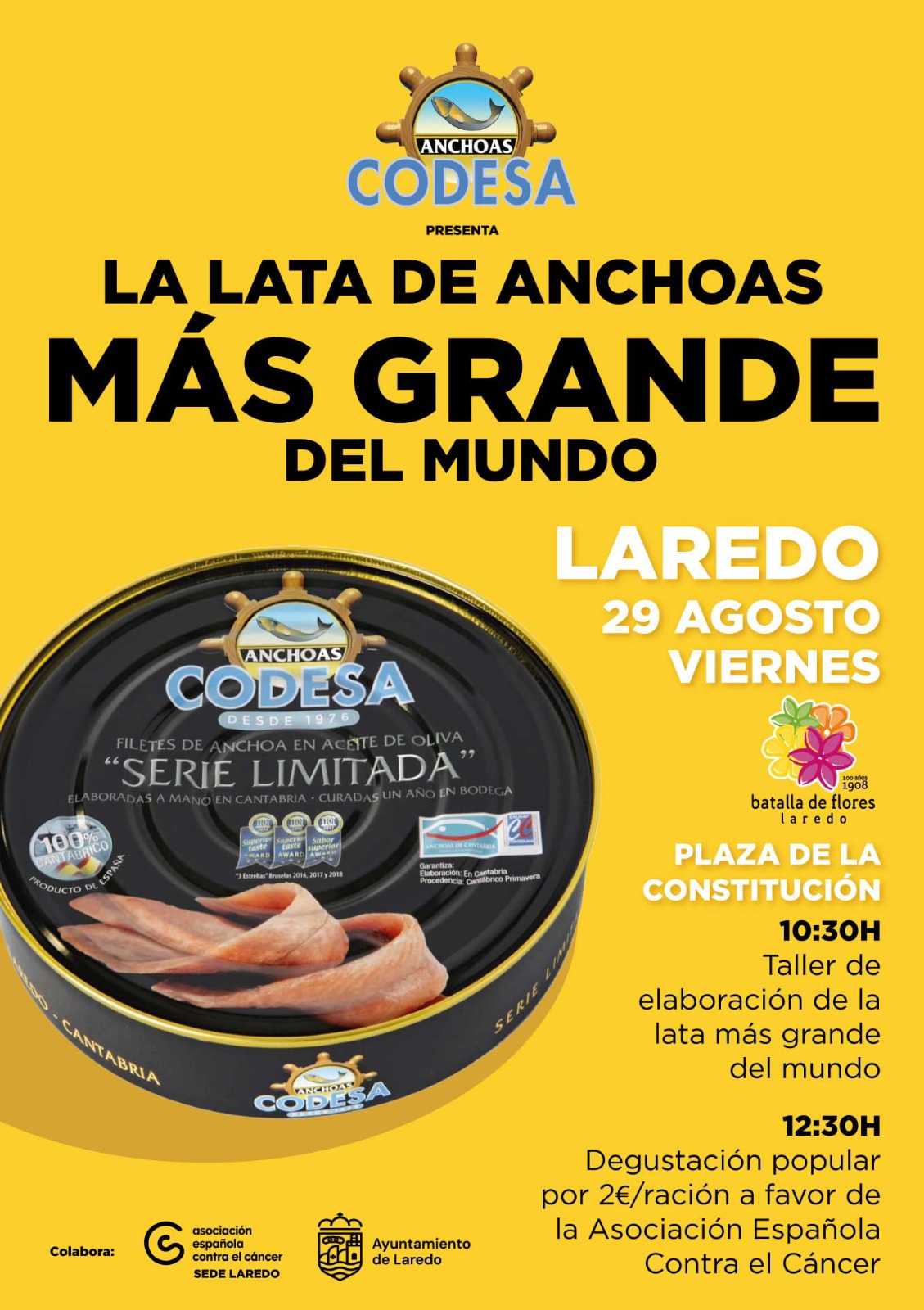El viernes 29 de agosto, coincidiendo con el día grande de Laredo la “Batalla de Flores” Fiesta de Interés Turístico Nacional, la conservera laredana CODESA afincada en la localidad, batirá el récord mundial elaborando la lata de anchoas 100% del Cantábrico más grande del mundo.