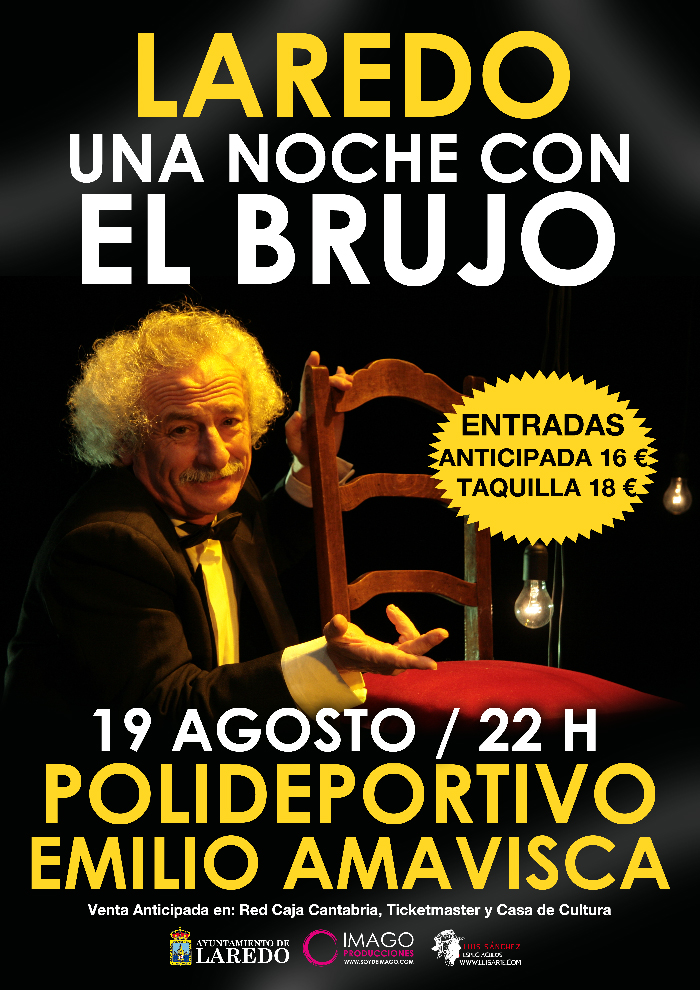 La noche del 19 de Agosto, a partir de las 22 horas, vive “Una noche con El Brujo” en el Polideportivo Emilio Amavisca de Laredo. Las entradas se pueden adquirir en la Casa de Cultura de Laredo, la red de Cajeros de Caja Cantabria o en Ticketmaster.com al precio de 16€ la anticipada