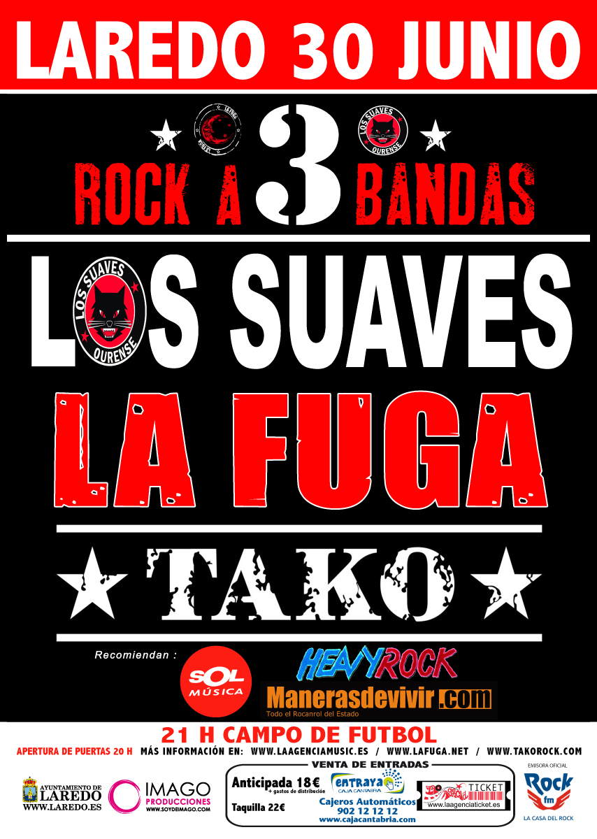 Laredo se prepara para vivir una auténtica noche de rock. El sábado 30 de Junio, Los Suaves, La Fuga y Tako darán un concierto en el que podremos disfrutar de más de 3 horas de auténtico rock. El concierto se enmarca dentro de la gira Rock a 3 Bandas que tiene programados conciertos por todo el país.