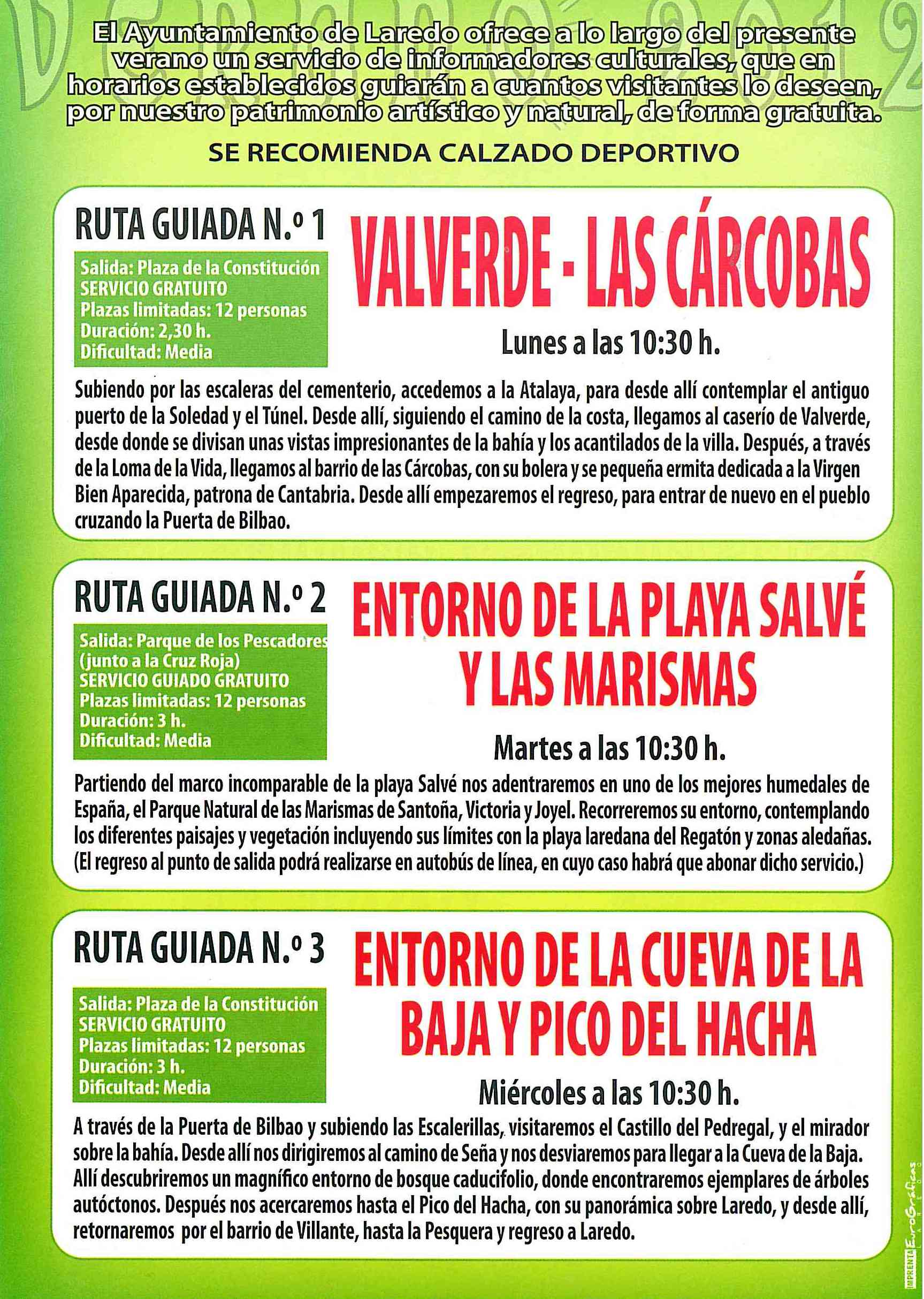 El Ayuntamiento de Laredo ofrece de forma gratuita a lo largo de la temporada de verano 2012 un servicio de informadores culturales y medioambientales, que en los días y horarios establecidos, guiarán a cuantos visitantes y residentes lo deseen por el patrimonio histórico, cultural y el privilegiado medio natural existente en la villa.