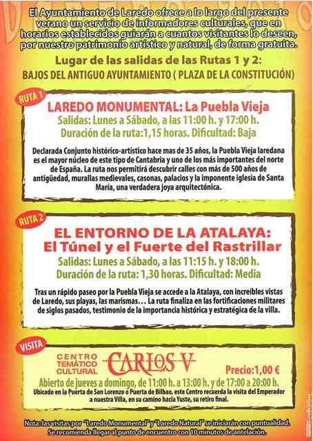 El Ayuntamiento de Laredo ofrece de forma gratuita a lo largo de la temporada de verano 2012 un servicio de informadores culturales y medioambientales, que en los días y horarios establecidos, guiarán a cuantos visitantes y residentes lo deseen por el patrimonio histórico, cultural y el privilegiado medio natural existente en la villa.