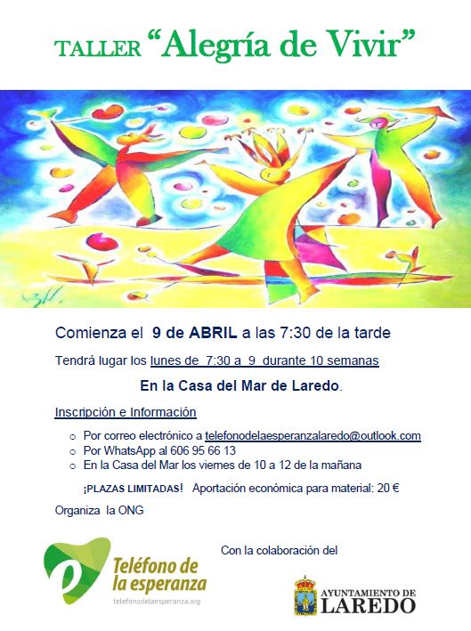 La ONG Teléfono de la Esperanza, con la colaboración del Ayuntamiento de Laredo, ha organizado el Taller “Alegría de Vivir”, que dará comienzo el 9 de abril de 2018, a las 19.30 h.