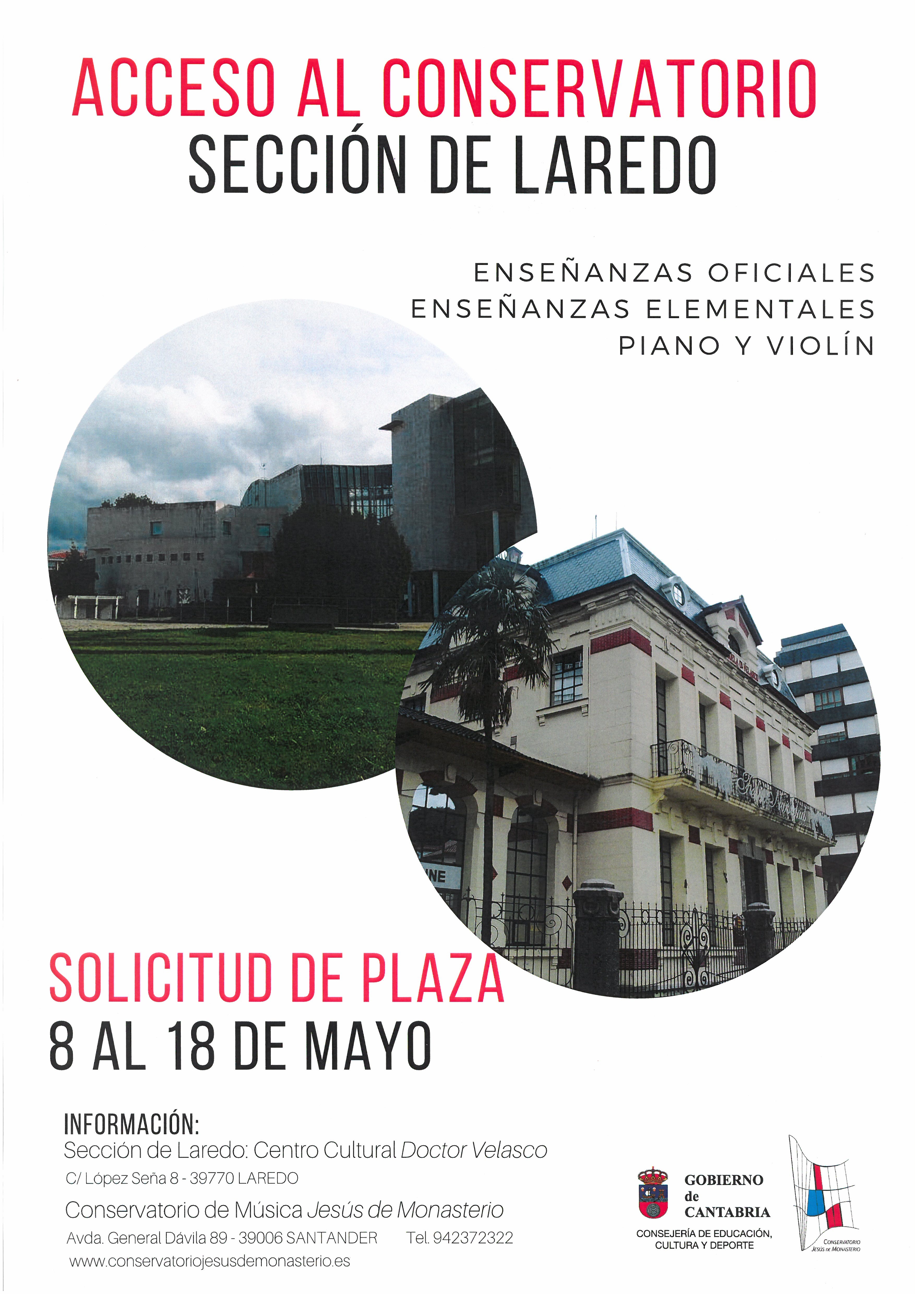 El pasado 8 de mayo se abrió el plazo para solicitar plaza en el Conservatorio Oficial de Música Jesús de Monasterio (Sede de Laredo) para el curso 2018-2019. El plazo de solicitud finaliza el 18 de mayo de 2018.