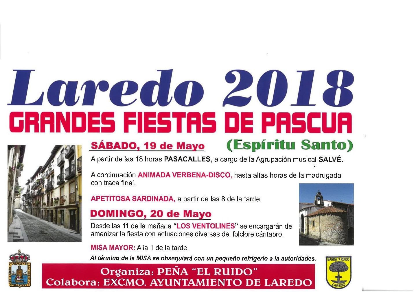 Los barrios laredanos del Espíritu Santo y Tinaco se disponen a celebrar la Festividad de Las Pascuas. El programa que ofrece la Peña “El Ruido “ con la colaboración del Ayuntamiento de Laredo dará comienzo mañana sábado 19 de mayo, a partir de las 18 horas con un pasacalles a cargo de la Agrupación Musical “La Salvé”. Partiendo de la Plaza de la Constitución recorrerán la C/ Revellón para adentrarse en la principal artería del barrio del Espíritu Santo. A continuación dará comienzo la Verbena-Disco y una gran sardinada en la placita que se forma junto a la ermita del Espíritu Santo.