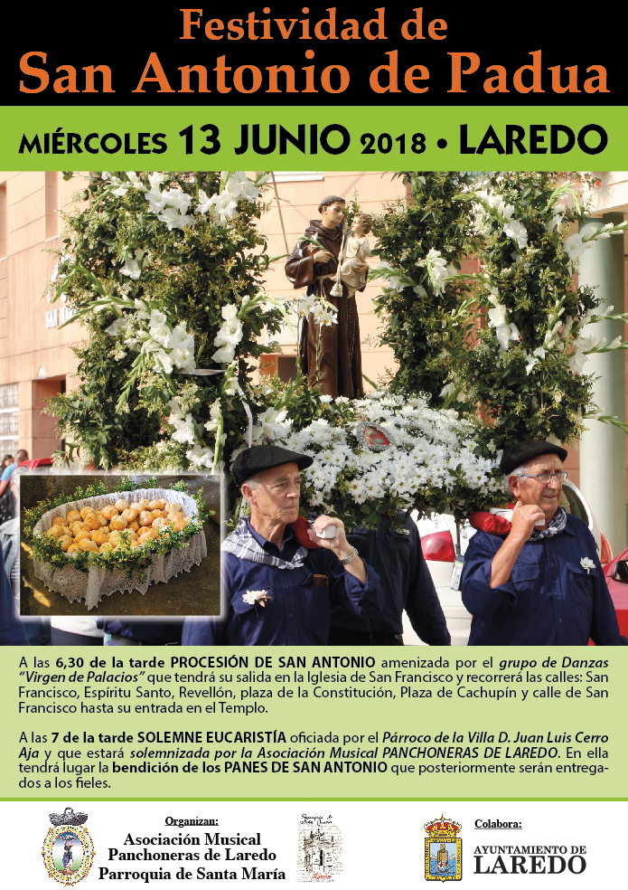 Este miércoles, 13 de junio, Laredo volverá a celebrar la Festividad de San Antonio de Padua, organizada por la Asociación Musical “Panchoneras de Laredo” y la Parroquia Santa María de la Asunción, con la colaboración del Ayuntamiento de Laredo.