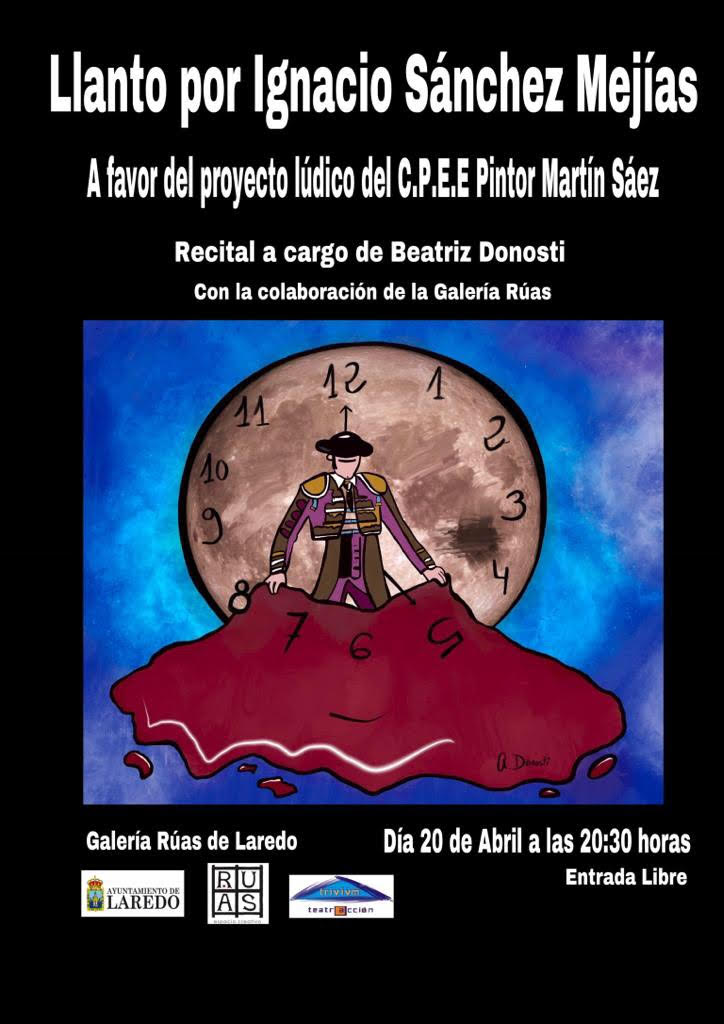 Este viernes, 15 de junio, a las 20.30 h. el Espacio Creativo Sala Rúas, situado en C/ Medio, 1, de la Puebla Vieja laredana, tendrá lugar el recital poético “Llanto por Ignacio Sánchez Mejías”, sobre textos de Federico García Lorca a cargo de Beatriz Donosti acompañada por miembros de Trivium teatro Acción. La entrada es libre.
