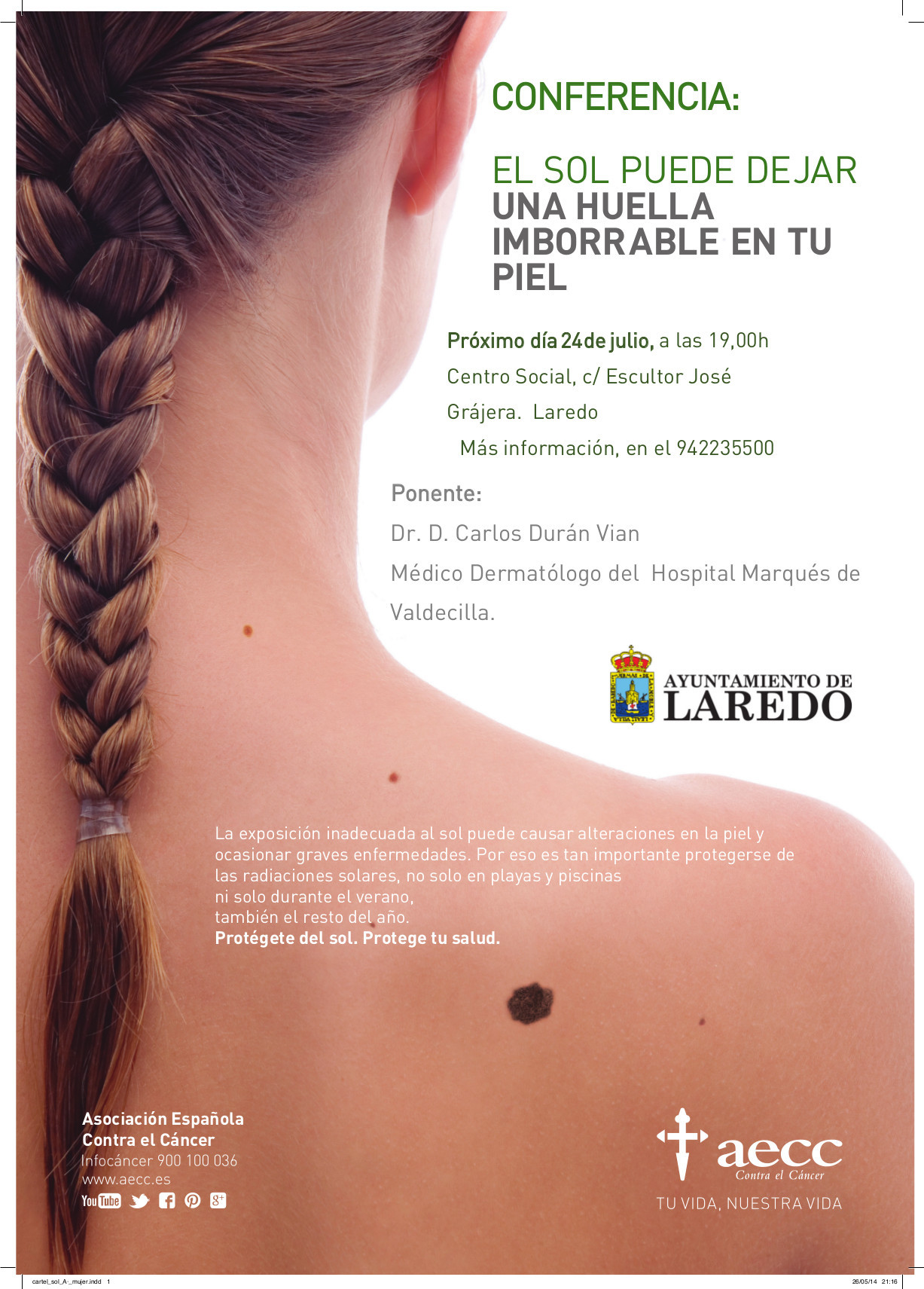 El próximo martes, 24 de julio, a las 10 h., tendrá lugar en el Centro Social de Laredo (Plaza Escultor José Grajera, s/n, Laredo), la conferencia “El sol puede dejar una huella imborrable en tu piel”, a cargo del doctor Carlos Durán Vian, Médico Dermatólogo del Hospital Universitario Marqués de Valdecilla.