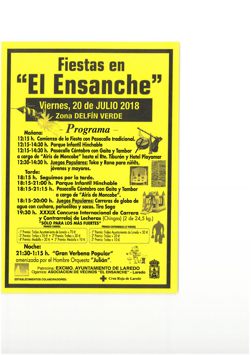 DESDE LA ASOCIACIÓN DE VECINOS "EL ENSANCHE" DE LAREDO COMUNICAN QUE DEBIDO A LA CLIMATOLOGÍA ADVERSA LAS FIESTAS DE "EL ENSANCHE" DE LAREDO PREVISTAS PARA HOY, VIERNES, 20 DE JULIO DE 2018, SE TRASLADAN AL JUEVES, 26 DE JULIO DE 2018, CON EL MISMO PROGRAMA.