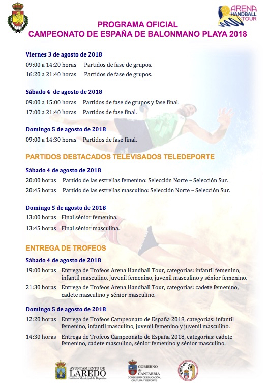 Todos aquellos aficionados que no puedan disfrutar in situ de los partidos y del ambiente, podrán seguir a través del straming de la Real Federación Española de Balonmano, a partir del viernes por la mañana, los encuentros de este XX Campeonato de España que se disputen en la pista central de Laredo. Tres días repletos de balonmano playa y de espectáculo con los que el público podrá vibrar tanto en la playa Salvé como dese sus casas.