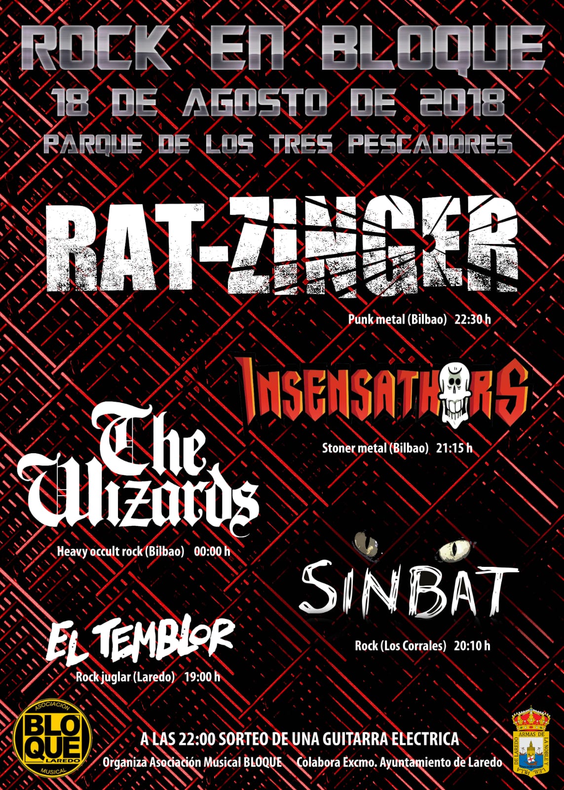 El concierto del sábado, 18 estará dedicado al rock.Bajo el lema “Rock en Bloque”, a partir de las 19 h. actuarán “El Temblor”; “Sinbat” (20.10 h.); “Insensathors” stoner metal (Bilbao) ( 21.15 h.); “Rat-Zinger”, punk metal (Bilbao) ( 22.30 h.) y, a las 24 h. “The Wizards” heavy occult rock (Bilbao).