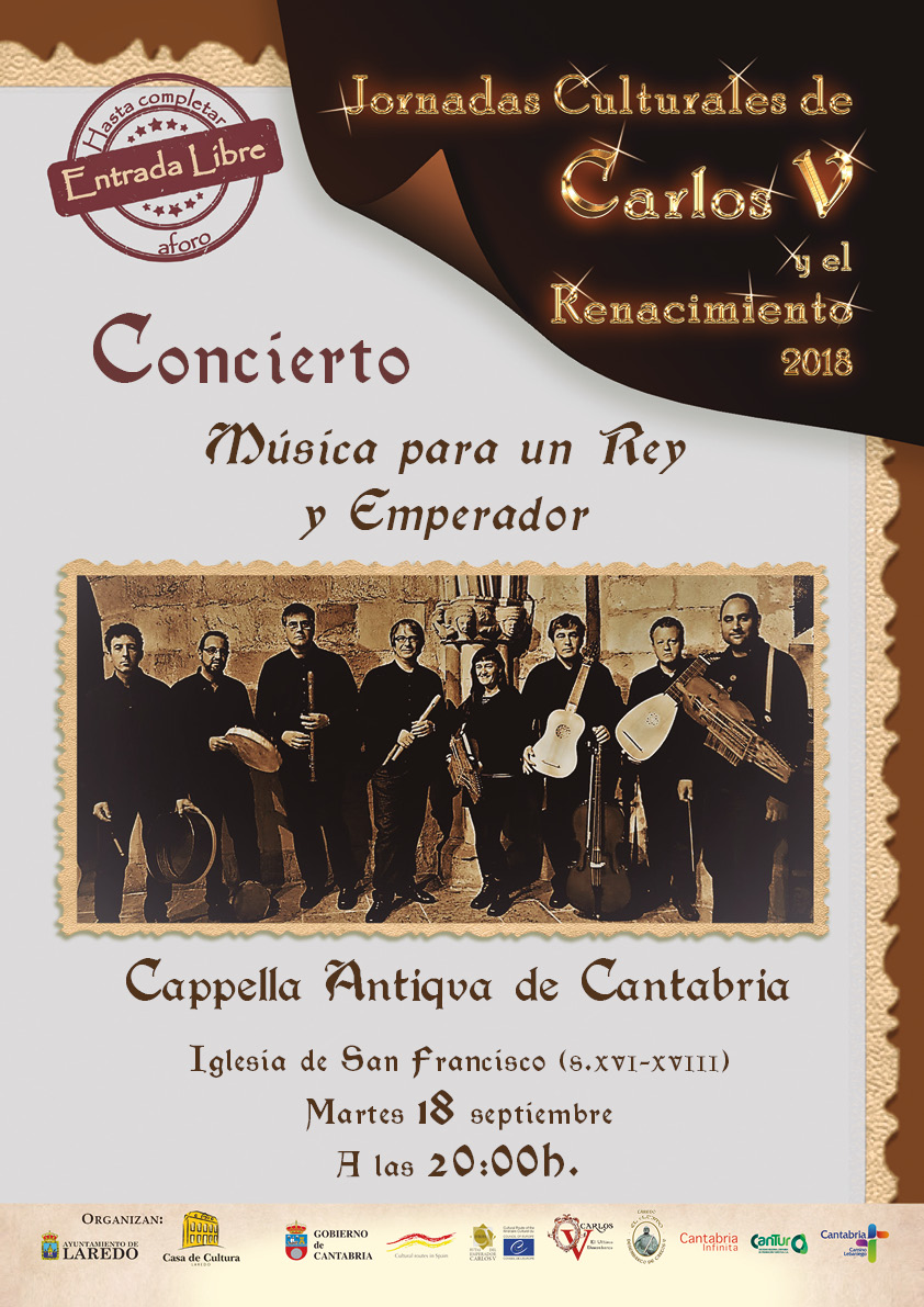Música renacentista. "Música para un Rey y Emperador", concierto a cargo de Cappella Antiqua de Cantabria, dirigida por Manuel Galán. 20 h. en la iglesia clasicista de San Francisco, de Laredo. Entrada libre.