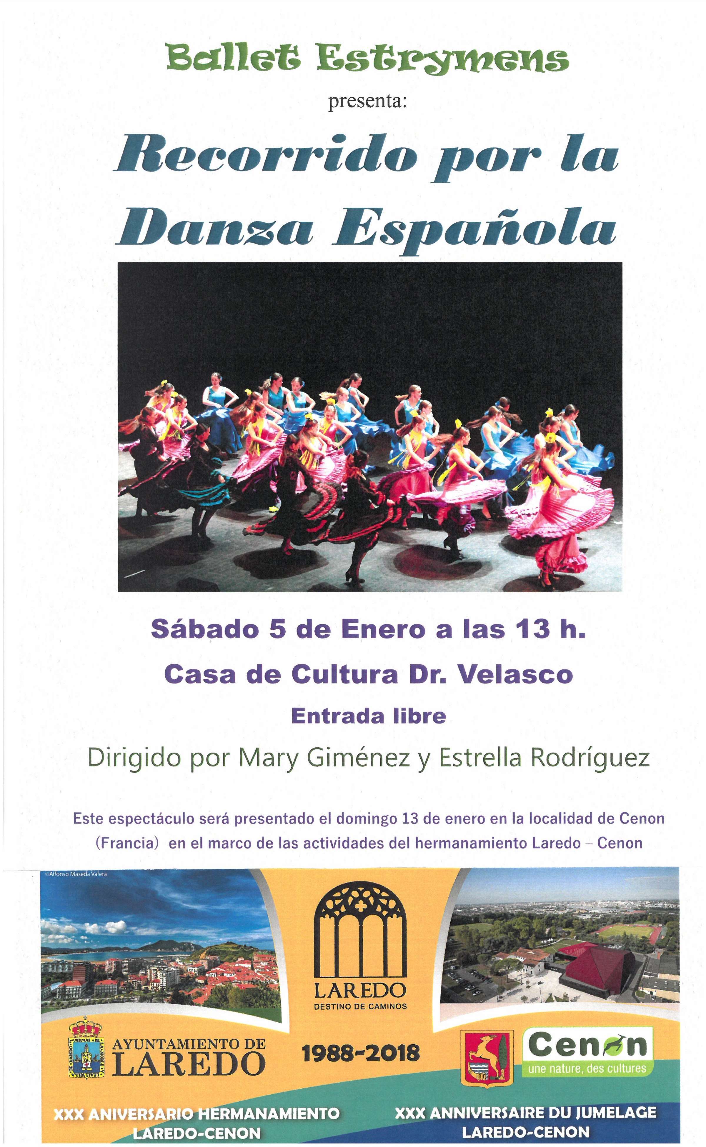 Este sábado, 5 de enero, a las 13 h., en el Salón de Actos de la Casa de Cultura Dr. Velasco, de Laredo, el Ballet Estrymens, dirigido por Mary Giménez y Estrella Rodríguez, presentan el espectáculo de danza “ Recorrido por la Danza Española”.