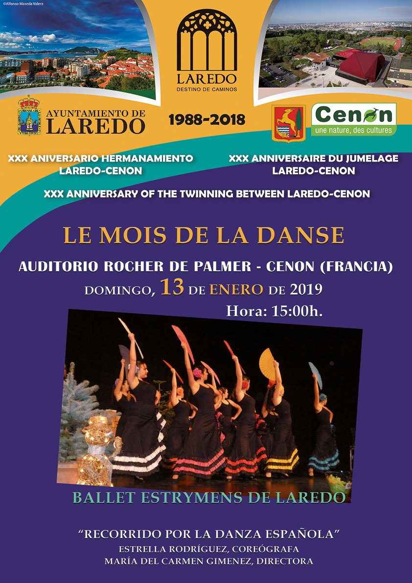 Mañana, sábado 12 de enero, el Ballet Etrymens de Laredo, invitado por el Ayuntamiento de Cenon se desplazará a esa ciudad bordelesa para ofrecer el espectáculo “Recorrido por la Danza Española” en el Auditorio Rocher de Palmer que tendrá lugar el domingo, 13 de enero , a las 15 h.