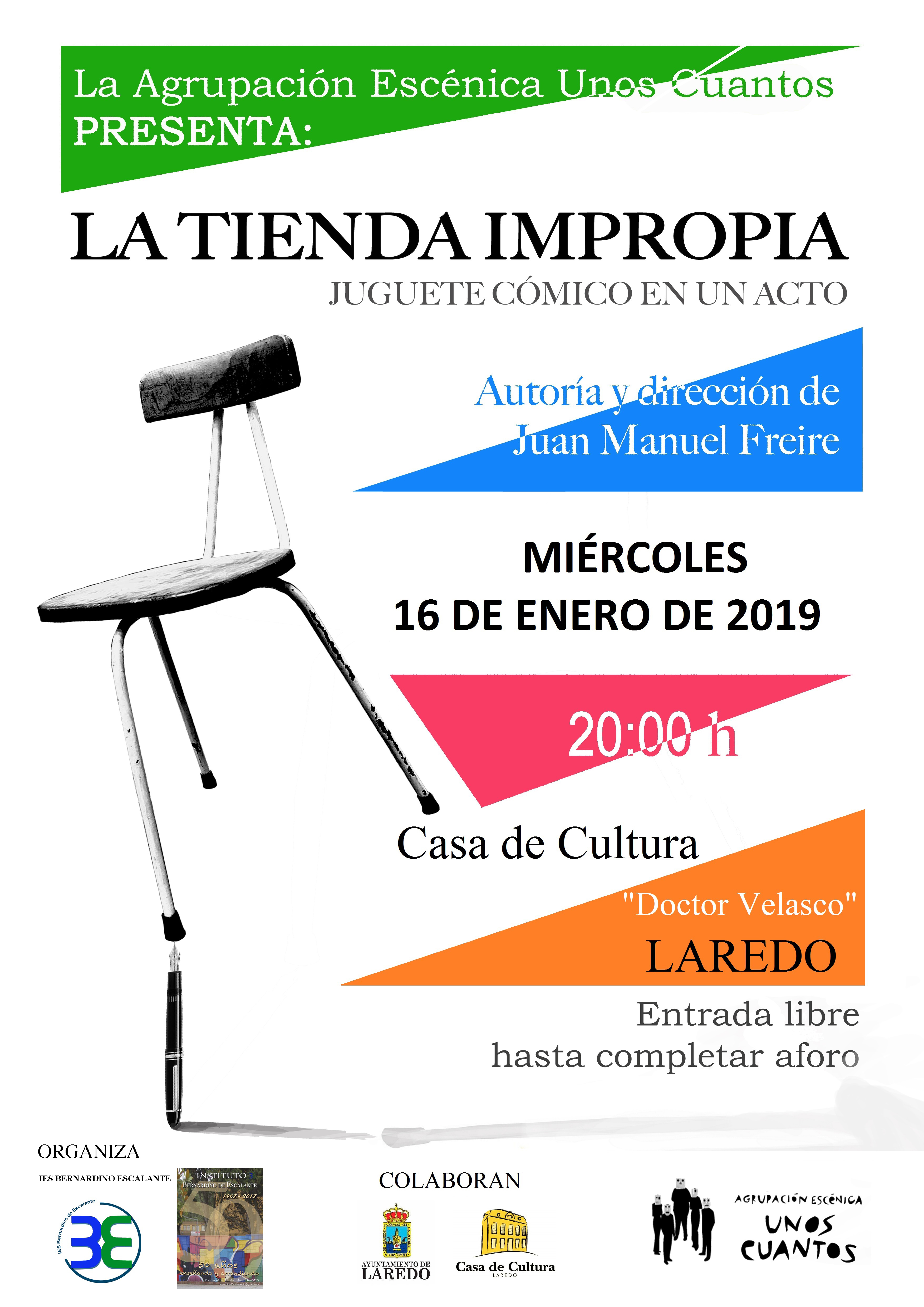 El próximo miércoles 16 de enero, darán comienzo los actos programados por el IES Bernardino de Escalante, de Laredo, para conmemorar su 50 aniversario Y lo hará con la representación teatral “ Una tienda impropia. Juguete cómico en un acto”, por la agrupación escénica “unos cuantos”, de Santander. El autor y director de la broa es Juan Manuel Freire, que ha sido profesor de lengua y literatura castellana del citado instituto.