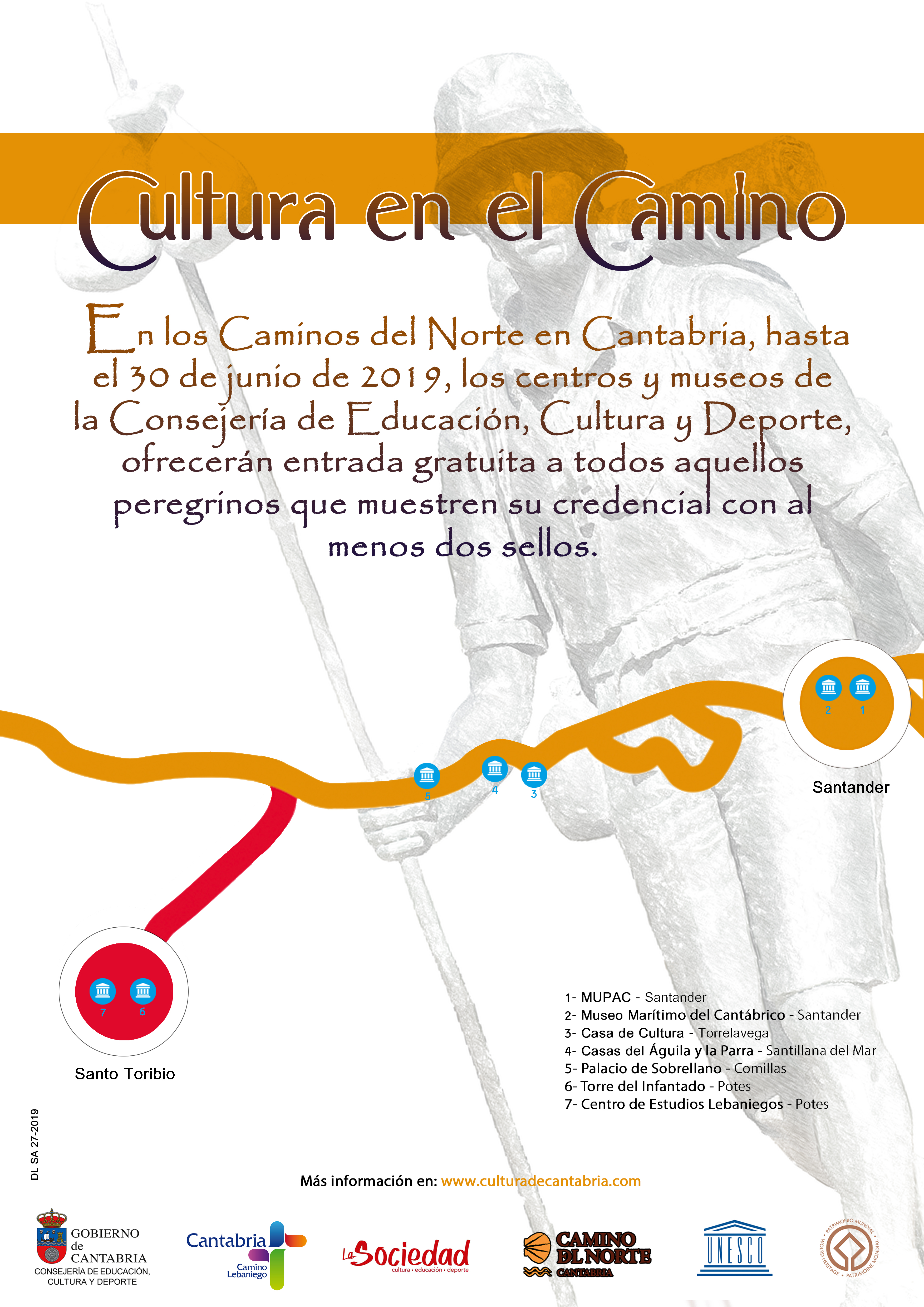 En los Caminos del Norte en Cantabria, hasta el 30 de junio de 2019, los centros y museos de la Consejería de Educación, Cultura y Deporte del Gobierno de Cantabria, ofrecen entrada gratuita a todos aquellos peregrinos que muestren su credencial con, al menos, dos sellos.
