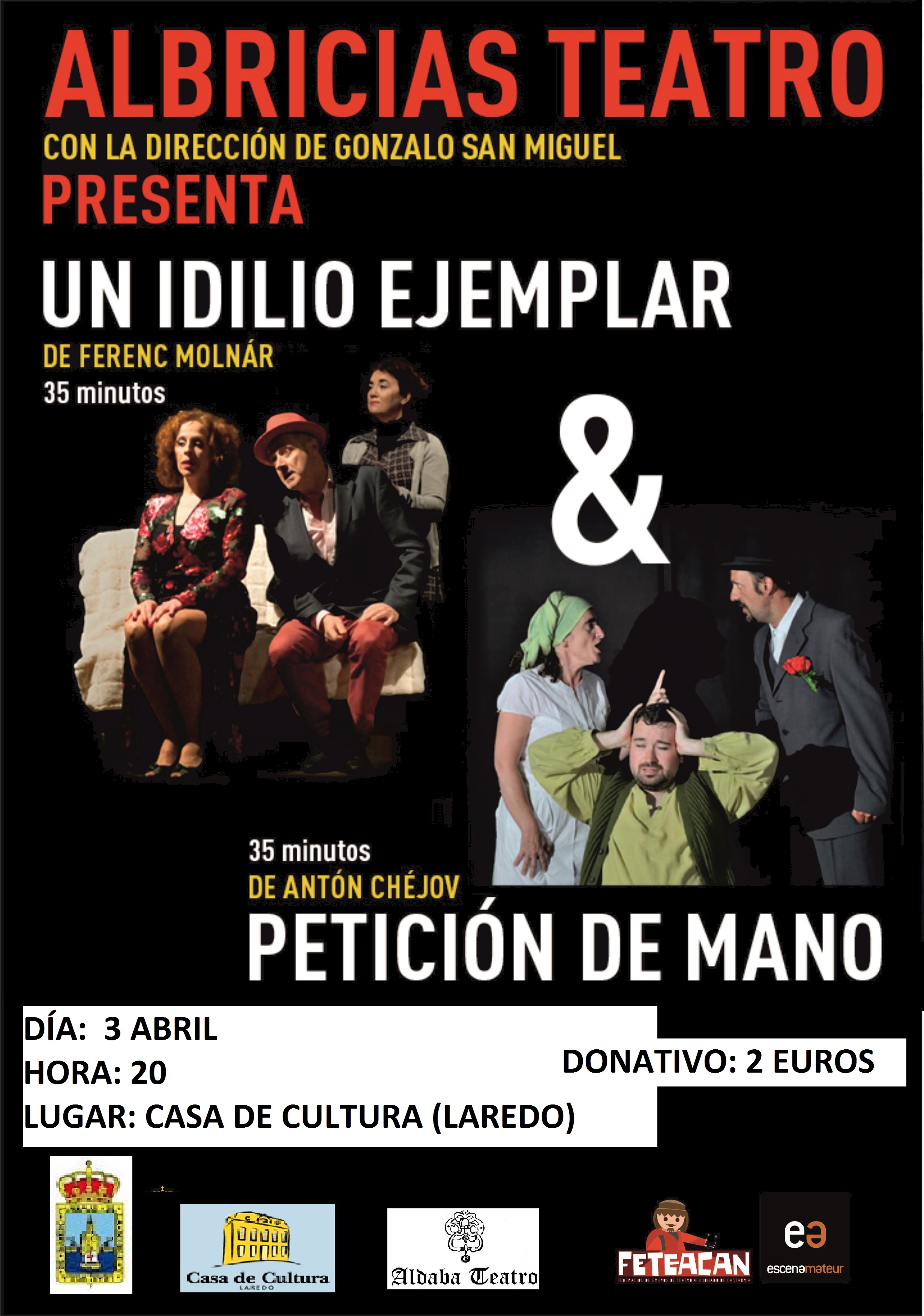 La Compañía “Albricias Teatro ” de Cabezón de la Sal , abrirá la muestra con las obras “Un idilio ejemplar " y Petición de mano”, este miércoles 3 de abril.