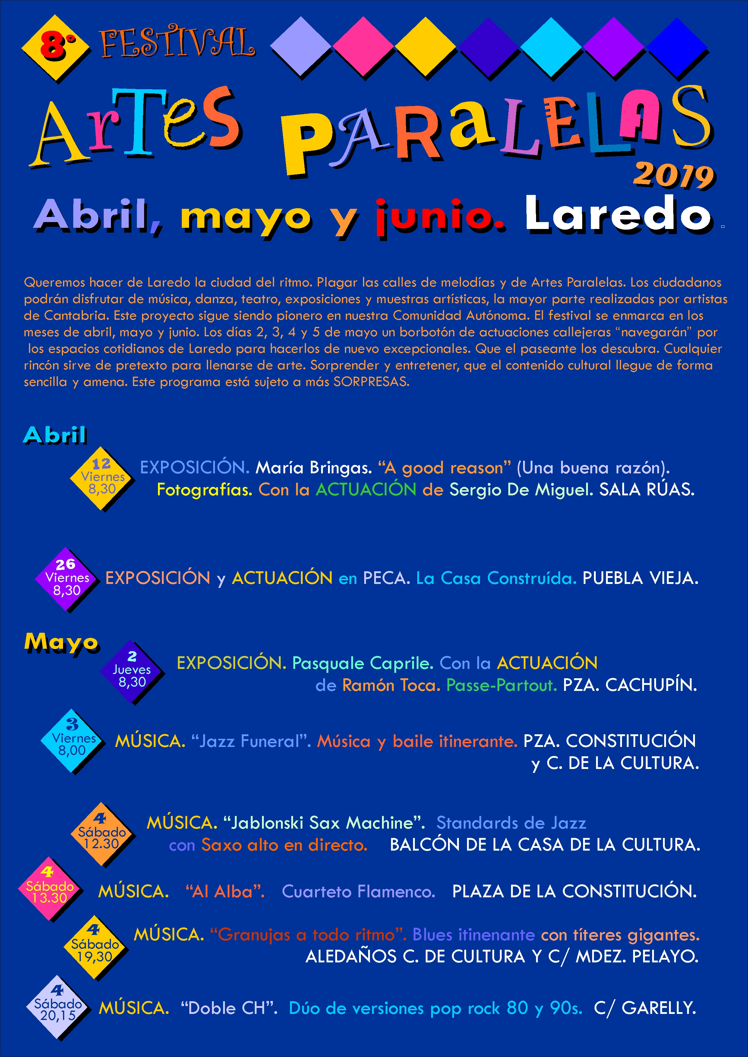 El pasado 12 de abril dio comienzo la VIII Edición del Festival de Artes Paralelas haciendo que Laredo se convierta en un gran escenario al aire libre donde se desarrollan las actividades programadas por Trivium Teatro Acción y Espacio Creativo Sala Rúas, con el patrocinio del Ayuntamiento de Laredo.