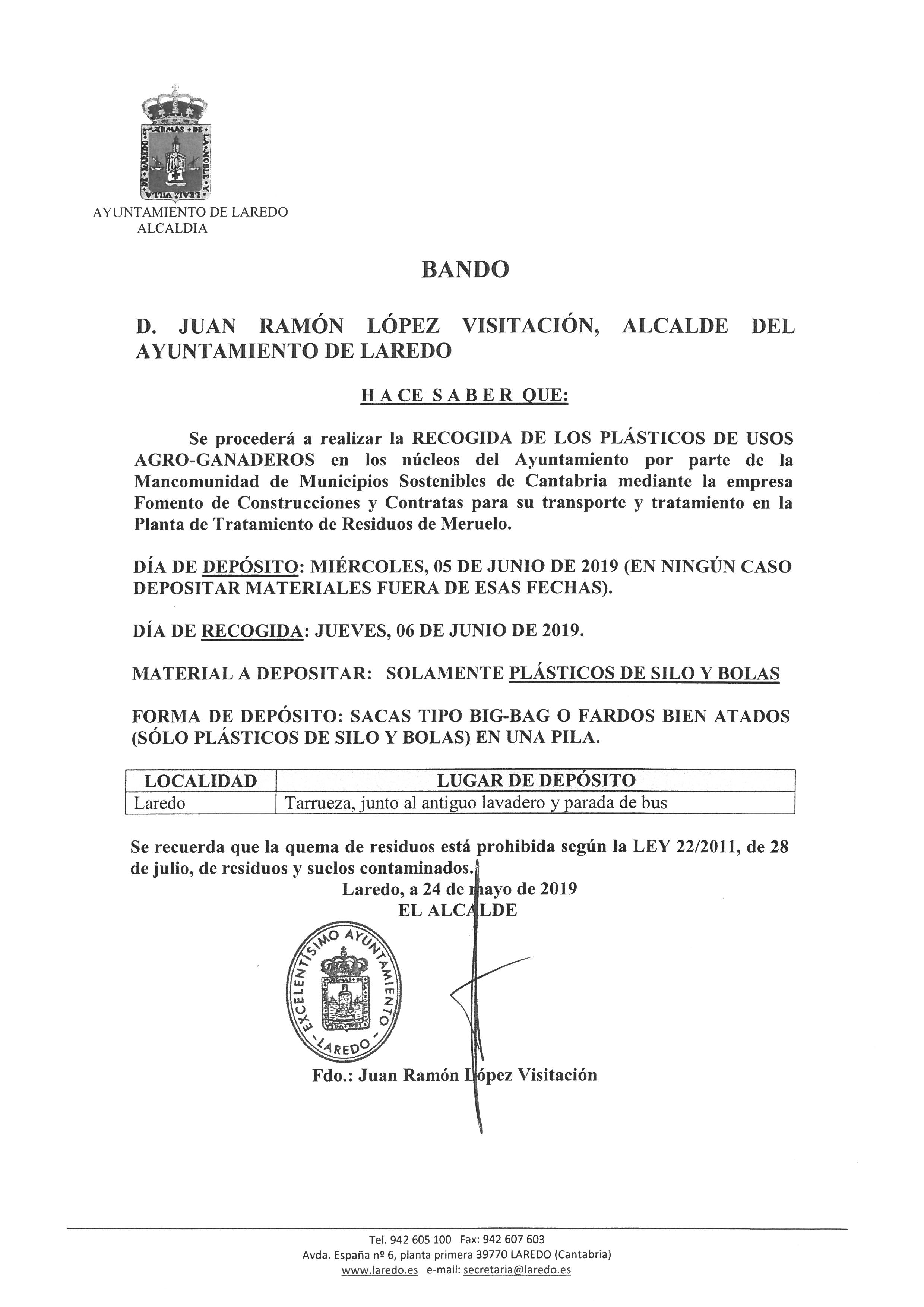 BANDO ALCALDÍA LAREDO. RECOGIDA DE LOS PLÁSTICOS DE USOS AGRO-GANADEROS 5 Y 6 JUNIO 2019.