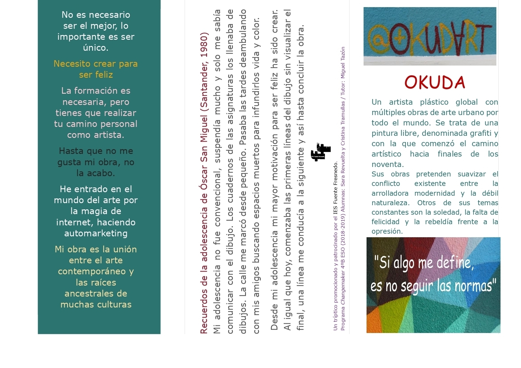 Sara Revuelta Fernández y Cristina Tramullas, explican en qué consiste su propuesta: “elaborar unos trípticos centrados en el grafiti en Laredo y, en la obra de “Okuda”, en especial la plasmada sobre la propia arquitectura de la Oficina de Información Turística de Laredo. El trabajo da a conocer una visión general del pensamiento y del mundo artístico de “Okuda”, a través de una de sus obras más cercanas y queridas”.