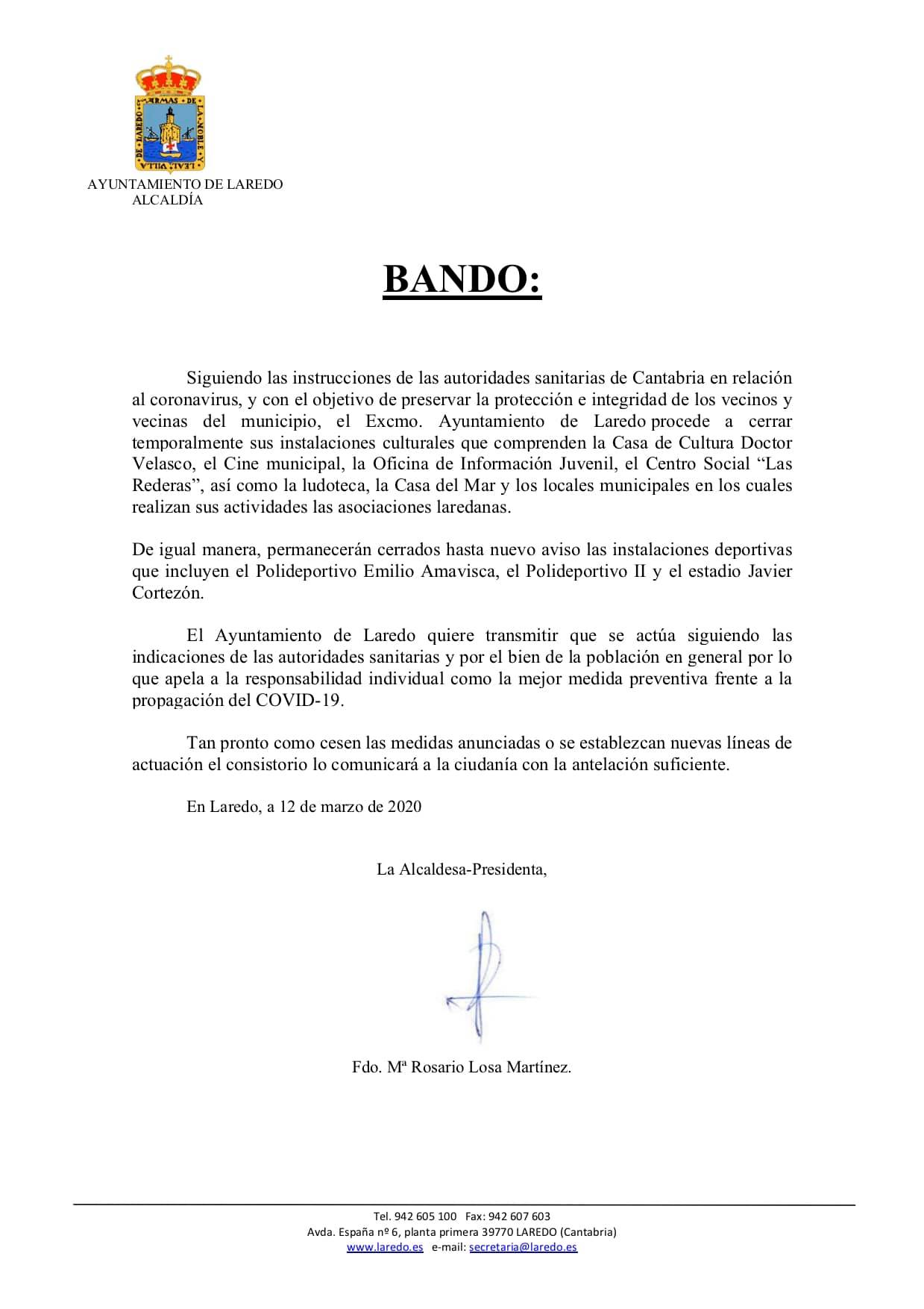 Ayer por la tarde, siguiendo las directrices de las autoridades sanitarias cántabras, la alcaldesa de Laredo, Charo Losa, anunciaba el cierre temporal de los diferentes edificios y locales de propiedad municipal, a través de un bando. La Casa de Cultura Doctor Velasco, el Cine municipal, la Oficina de Información Juvenil, el Centro Social “Las Rederas”, así como la ludoteca, la Casa del Mar y los locales municipales en los cuales realizan habitualmente sus actividades las asociaciones laredanas, se han cerrado temporalmente. De igual manera, cierran sus puertas hasta nuevo aviso las instalaciones deportivas dependientes del consistorio, que incluyen el Polideportivo Emilio Amavisca, el Polideportivo II y el estadio Javier Cortezón.