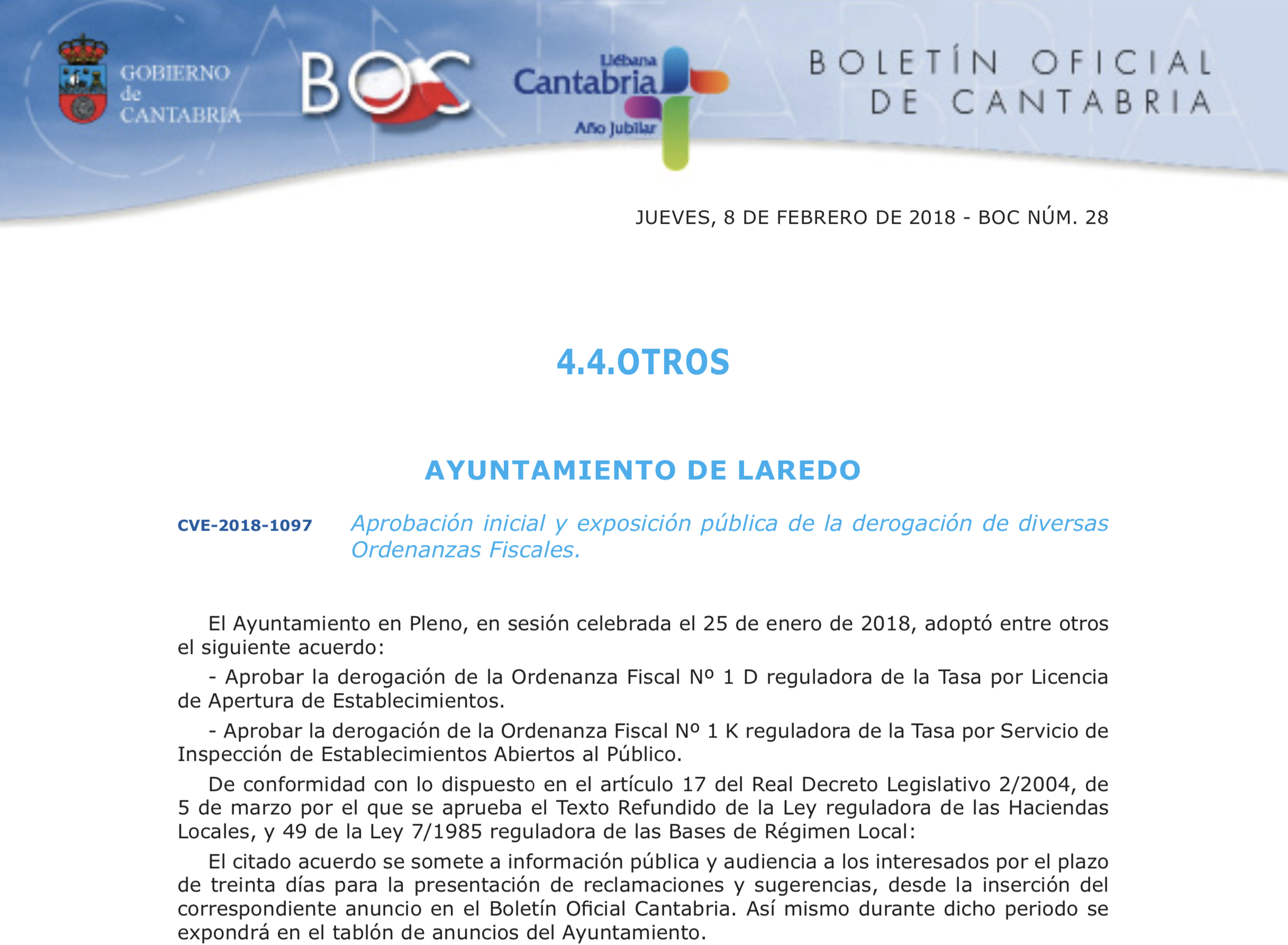 El Ayuntamiento de Laredo no ha cobrado las tasas por licencia de apertura ni por el servicio de inspección de establecimientos. El equipo de gobierno local lo demuestra con la publicación realizada en el BOC, número 28, del 8 de febrero de 2018. Nada más aprobarse en Pleno la derogación de las Ordenanzas fiscales 1D y 1K, se hizo pública esta modificación de la normativa por los canales oficiales y fue reflejada en el BOC y el BOE conforme a la Ley.