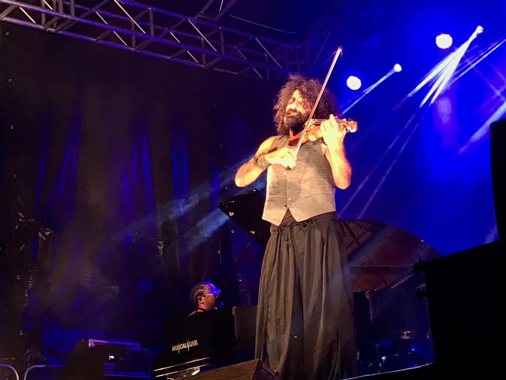 La villa pejina ha asistido ayer noche a un conmovedor espectáculo que mantuvo la atención de los presentes, inmóviles y sin pestañear en sus asientos, durante la mayor parte de la actuación. El violinista Ara Malikian comenzaba su actuación en la oscuridad, acompañado sólo por su violín y portando su mascarilla, caminando por el perímetro que rodeaba los 600 asientos separados entre si a dos metros de distancia. Con su sobrecogedora melodía se abrió paso entre un público que permanecía sigiloso y concentrado hasta llegar al escenario provocando un entusiasta aplauso, al concluir su primer tema, que resonó en el estadio del Charles. Magistralmente acompañado por el pianista Iván “Melón” Lewis, las melodías del violinista trasladaron a los presentes por unos instantes lejos de la constante actualidad de la pandemia. Una actuación de calidad en un guiño simbólico a la Batalla de Flores de la villa, que ha tenido que suspenderse debido al COVID-19. Con todas las medidas de seguridad necesarias, el espíritu alegre y festivo del municipio se abre camino.