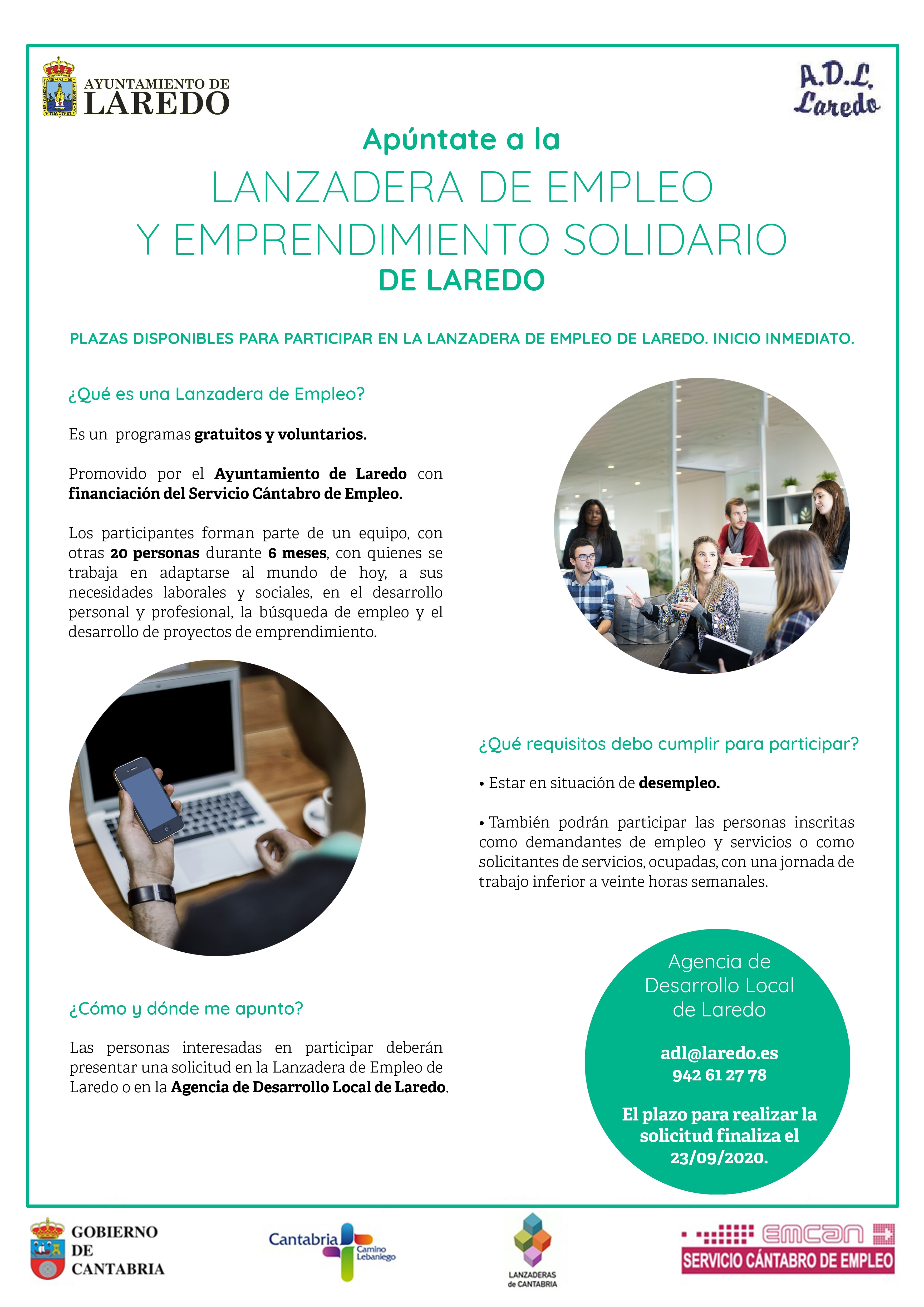 El Ayuntamiento de Laredo pone en marcha la séptima edición de la Lanzadera de Empleo y Emprendimiento Solidario. La iniciativa está dirigida a desempleados inscritos en el Servicio Cántabro de Empleo o a trabajadores cuya jornada laboral no supere las veinte horas semanales. Los interesados podrán informarse acerca de este programa de mejora de la empleabilidad en la Agencia de Desarrollo Local (ADL) de Laredo, llamando al 942 61 27 78 o enviando un correo a la dirección: adl@laredo.es