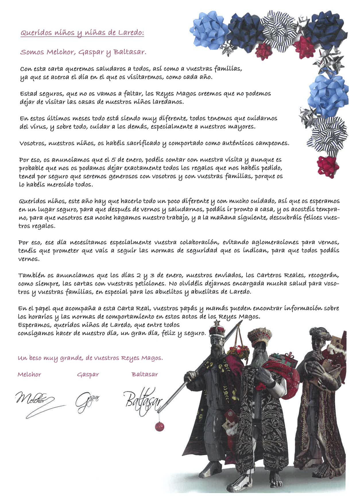 ¡Laredo se prepara para recibir a los Reyes Magos de Oriente y a sus Carteros Reales con total seguridad! Los niños y niñas de la villa pejina comienzan ya a recibir por correo sus sobres con todas las instrucciones de precaución para poder disfrutar de la visita de los Carteros Reales los días 2 y 3 de enero y de sus Majestades el día 5. Aquí podrás descargar toda la información para acudir a su encuentro y rellenar los formularios para asistir a su recibimiento.