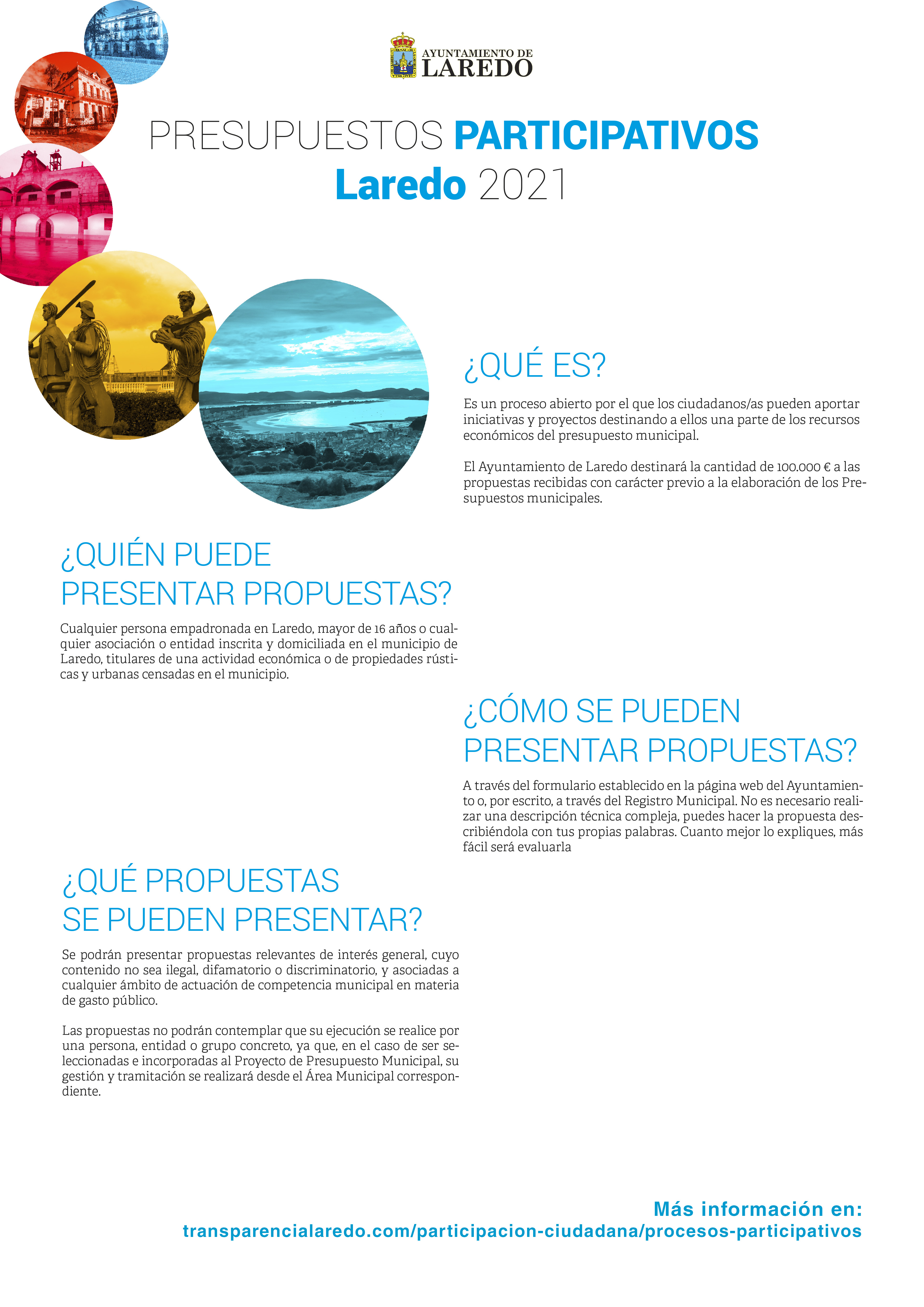 Podrá presentar propuestas cualquier persona empadronada en Laredo mayor de 16 años, cualquier asociación o entidad domiciliada en el municipio de Laredo o titulares de una actividad económica o de propiedades rústicas y urbanas censadas en el municipio.