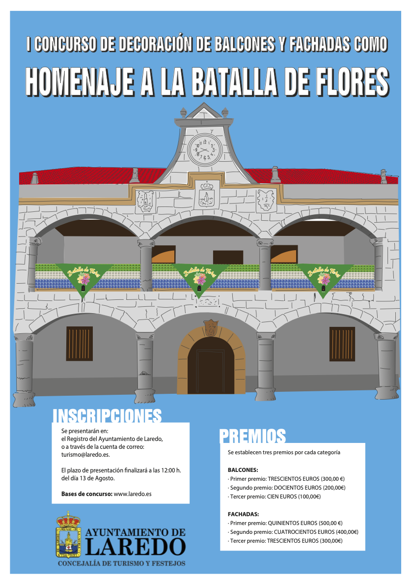 El Ayuntamiento de Laredo, a través de la Concejalía de Festejos y Turismo, promueve el Concurso de Decoración de Balcones y Fachadas para homenajear la fiesta pejina por excelencia, la Batalla de Flores, que en esta ocasión no podrá celebrarse a consecuencia de la pandemia. En estos momentos difíciles en los que el festejo no puede llevarse a cabo, la iniciativa es un gesto que rememora la Batalla de Flores engalanando las calles de la villa pejina con los emblemas de su fiesta grande.