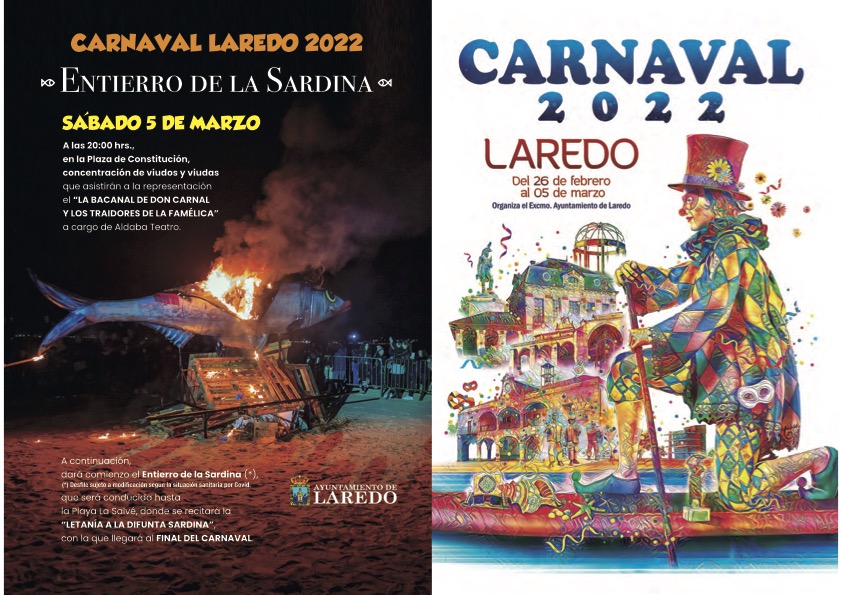 El sábado 5 de marzo, Laredo se viste de luto para el Entierro de la Sardina. En la plaza de Constitución, a las 20:00 horas, se lleva a cabo la concentración de viudos y viudas que asisten a la representación de “La bacanal de Don Carnal y los traidores de la Famélica” a cargo de Aldaba Teatro. A continuación, dará comienzo el Entierro de la Sardina, que será conducida hasta la Playa La Salvé, donde se recitará la “Letanía a la difunta sardina”, con la que el Carnaval llegará a su fin. TODOS LOS EVENTOS SON SUSCEPTIBLES DE MODIFICACIÓN CONFORME A LA SITUACIÓN SANITARIA DERIVADA DEL COVID-19.