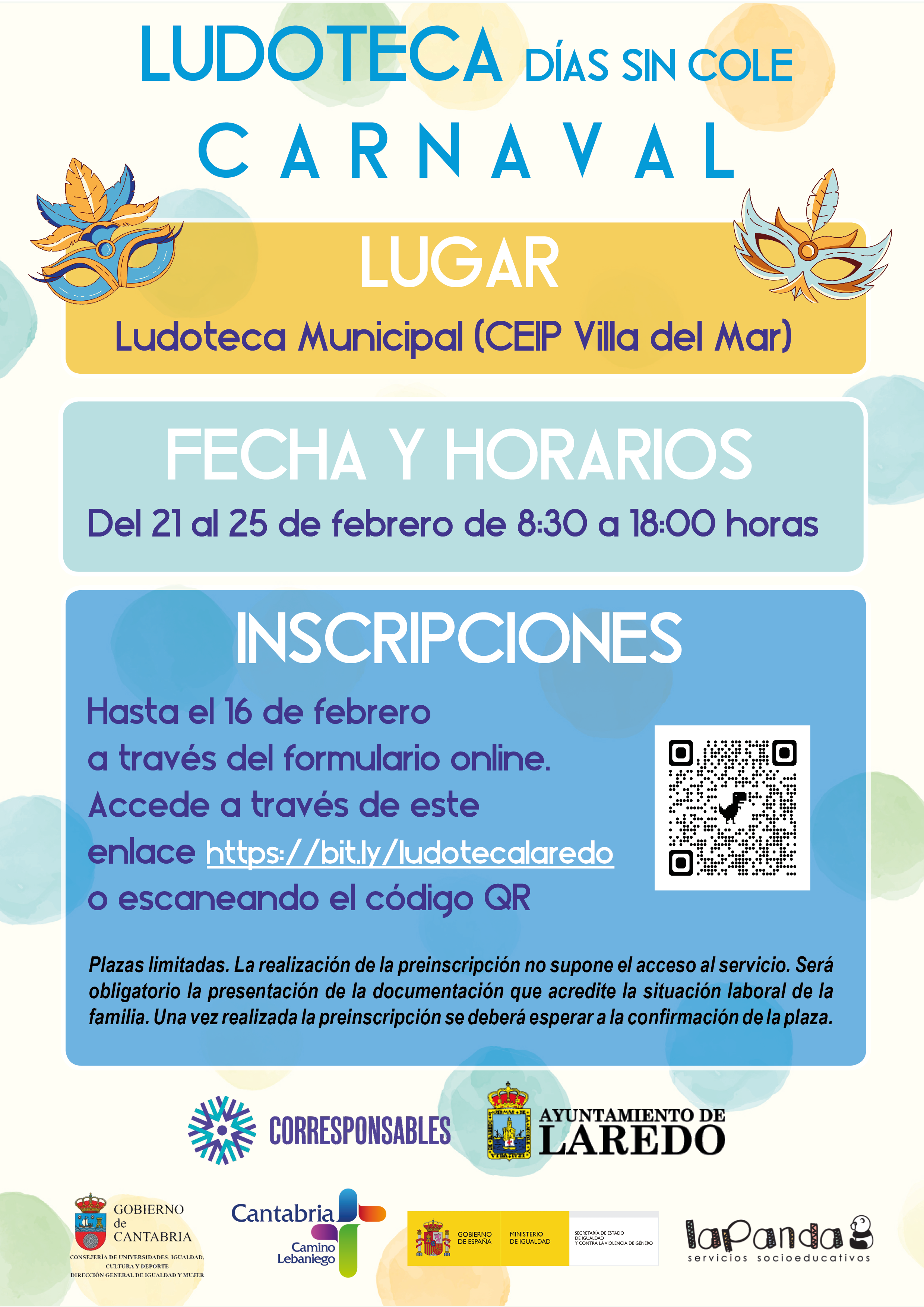 Se abre el plazo de inscripción para el servicio de Ludoteca para los días sin colegio de las fiestas de Carnaval. Las inscripciones pueden realizarse, hasta el 16 de febrero, a través del formulario online en https://bit.ly/ludotecalaredo o escaneando el código QR. La actividad tendrá lugar en la Ludoteca Municipal del CEIP Villa del Mar del 21 al 25 de febrero, en horario de 8:30 a 18:00 horas.