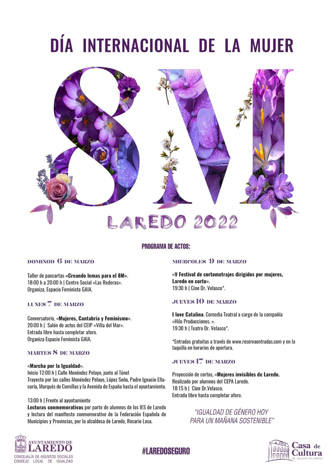 El 8 de marzo, Día Internacional de la Mujer, se llevará a cabo la “Marcha por la Igualdad, que iniciará su recorrido a las 12:00 horas en la calle Menéndez Pelayo, junto al Túnel y proseguirá su itinerario por López Seña; Padre Ignacio Ellacuría; Marqués de Comillas; y concluirá en el Ayuntamiento (ubicado en la Avenida de España). A las 13:00 horas, los alumnos de los IES de la villa pejina realizarán lecturas conmemorativas. La alcaldesa de Laredo, Charo Losa, procederá a dar lectura al manifiesto conmemorativo de la Federación Española de Municipios y Provincias (FEMP).