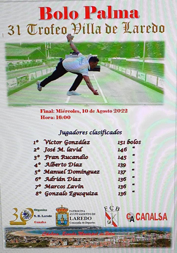 La fase final del Trofeo Villa de Laredo de Bolo Palma la disputaron los ocho primeros clasificados: Gonzalo Egusquiza, Marcos Lavín, Adrián Díaz, Manuel Domínguez, Alberto Díaz, Fran Rucandio, José Manuel Lavid y Victor González.